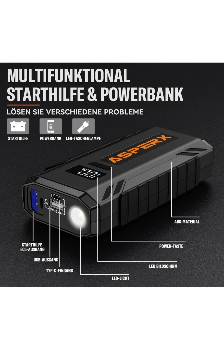 AsperX Car a jump starter power bank 2000a Features are displayed on a screen. Great to have in your car in case of emergencies, so you can rest easy knowing you have it on hand pick up Edmonton cash no transfers.