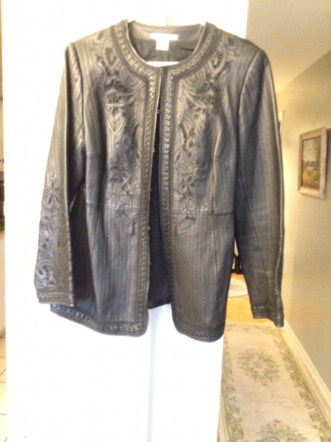 Genuine leather ladies jacket. Very clean and good condition, just doesn’t fit me any longer. Size 12. Beautiful delicate detailing.