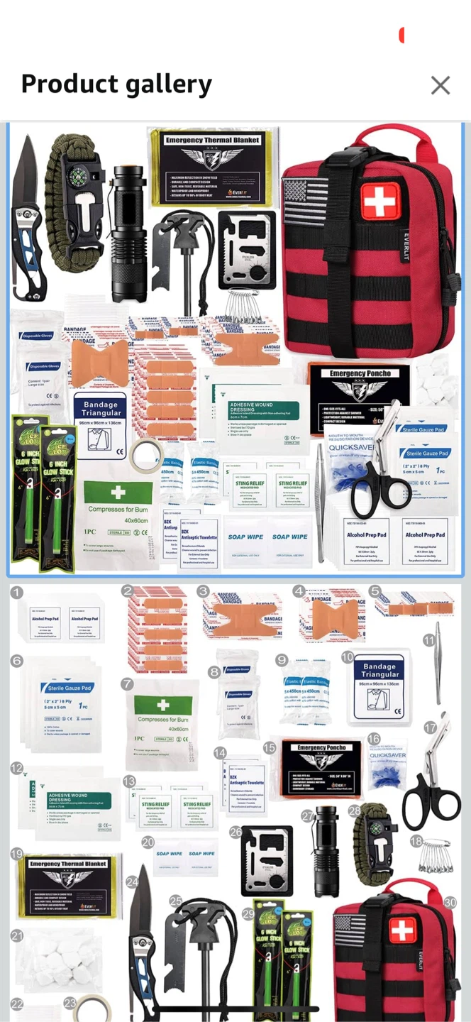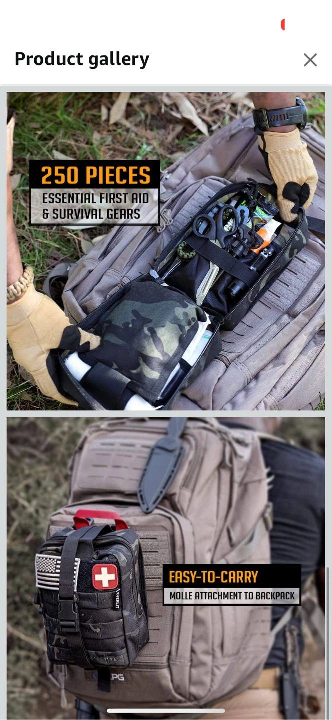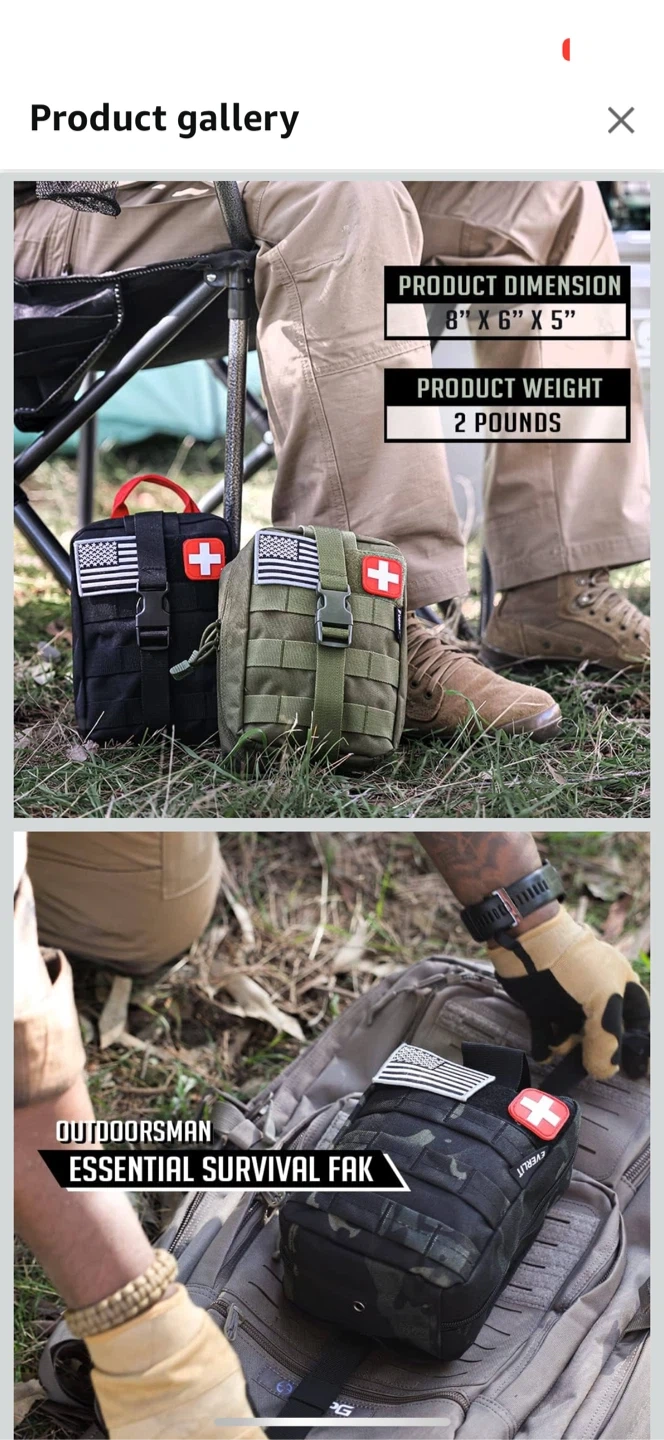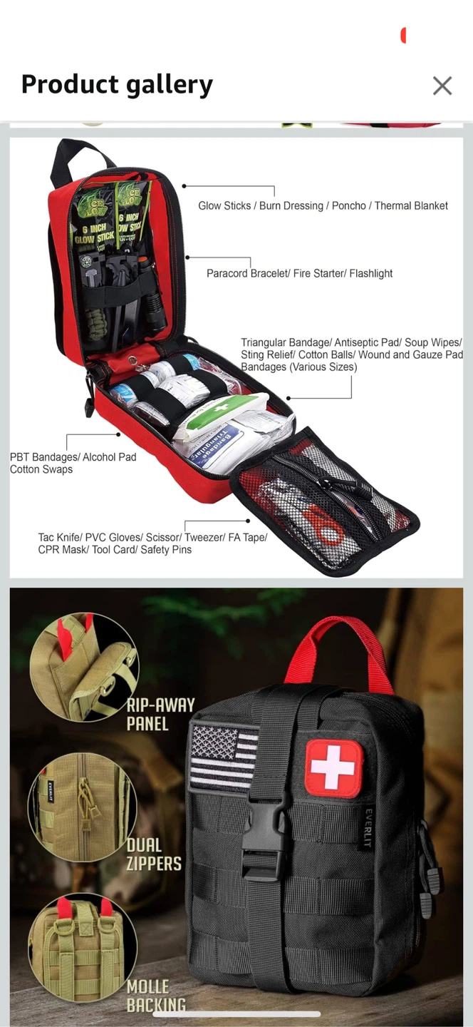 Selling an Everlit first aid and survival kit. It contains 250 essential first aid and survival items. It's easy to carry with a MOLLE attachment for a backpack. The product dimensions are 8" x 6" x 5" and it weighs 2 pounds