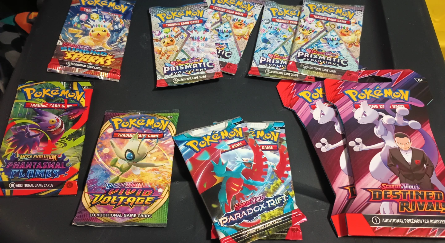 Selling a variety of Pokemon Trading Card Game booster packs! Includes packs from sets like Surging Sparks, Prismatic Evolutions, Phantasmal Flames, Vivid Voltage, Paradox Rift, and Destined Rivals. Perfect for collectors or players looking to expand their collection