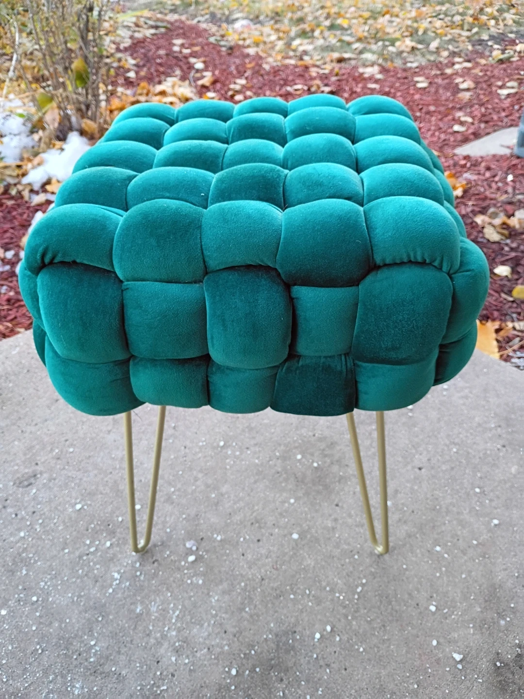 Here's a lovely Emerald green velvet woven ottoman foot stool! It would be a great addition to any room. The color is a vibrant green, and the material is soft velvet. It features a tufted design and gold hair pin legs