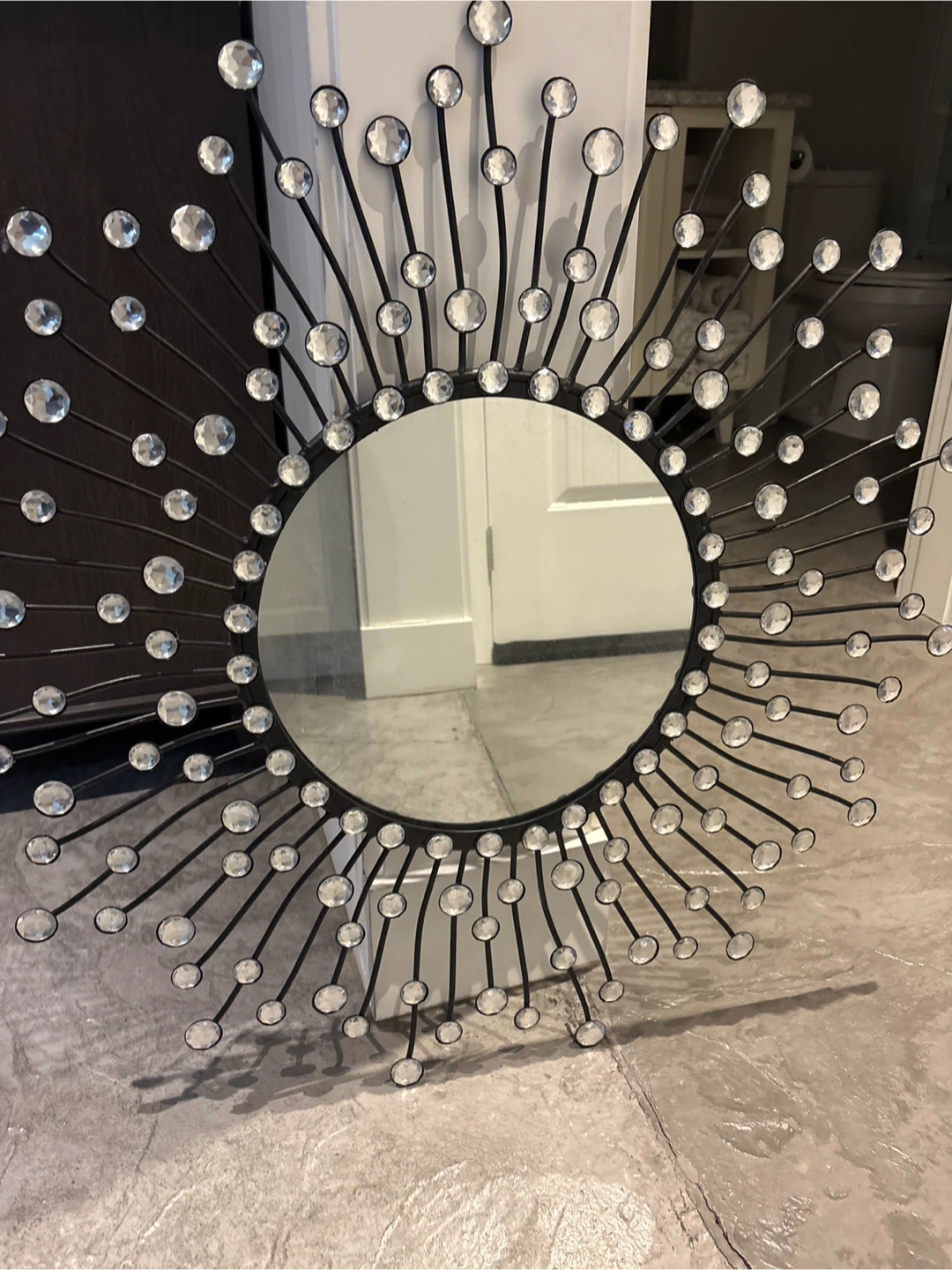 Selling a really cool sunburst mirror! It has a black metal frame with crystal-like accents on each ray. It would look great in any room and add a touch of sparkle