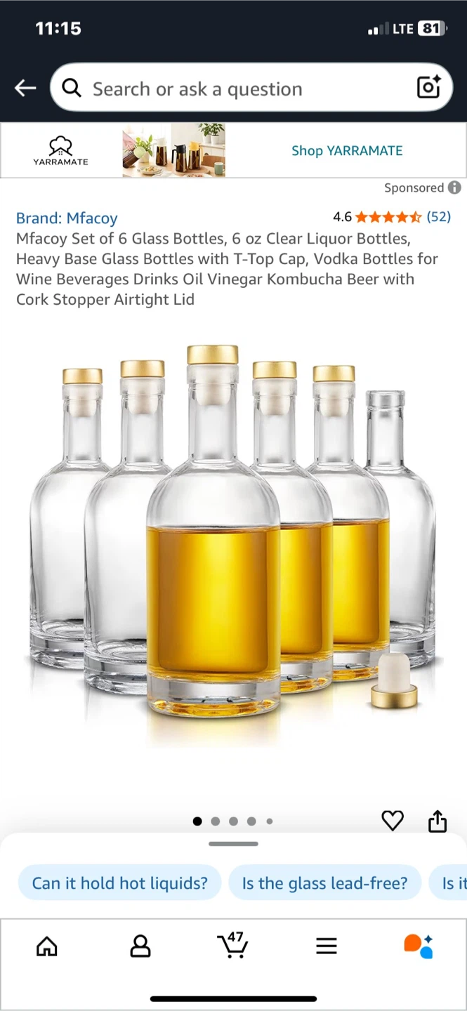 Selling a set of 6 clear glass liquor bottles from Mfacoy. These 6 oz bottles have a heavy base and come with T-top caps and cork stoppers, making them airtight. Perfect for storing wine, beverages, drinks, oil, vinegar, kombucha, or beer!
