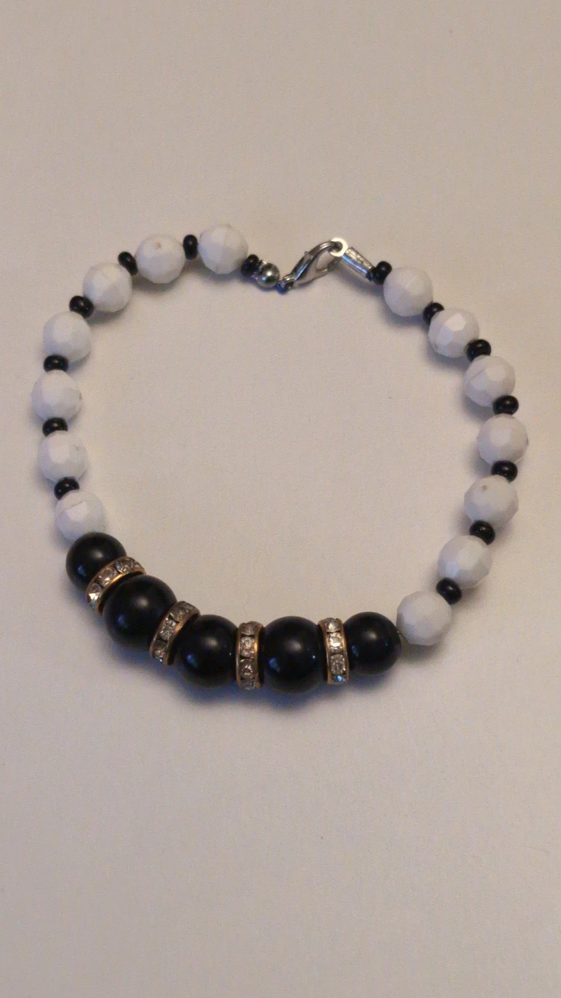 Selling a beaded bracelet with a mix of black and white beads. The black beads have decorative gold-tone accents. It's in great condition!