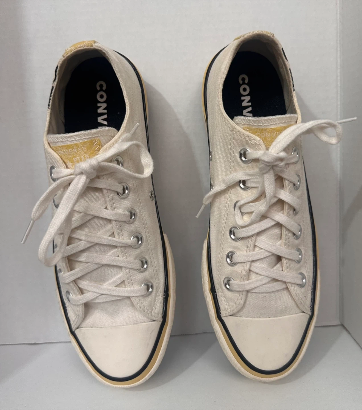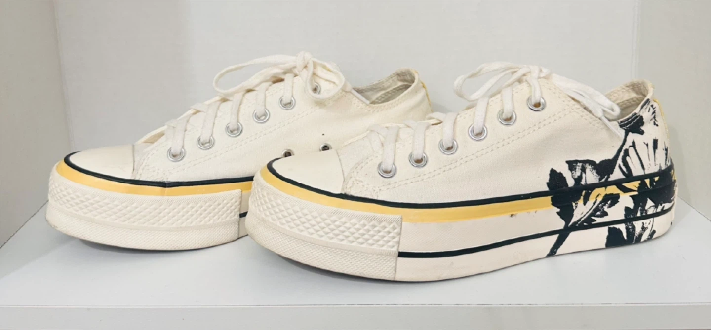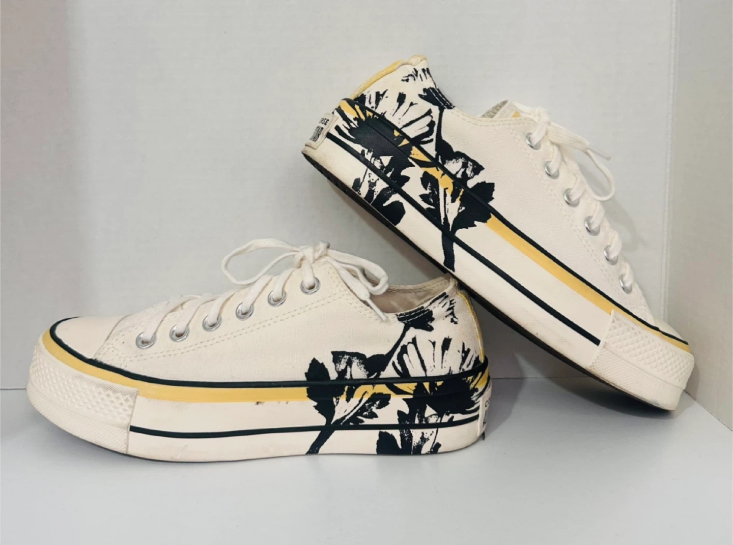 Selling a pair of Converse All Star Lift platform sneakers! They're slightly used and ready for a new home. These sneakers feature a stylish platform sole and the classic Converse design with a unique floral design on the side. Perfect for adding a bit of height and style to any outfit!