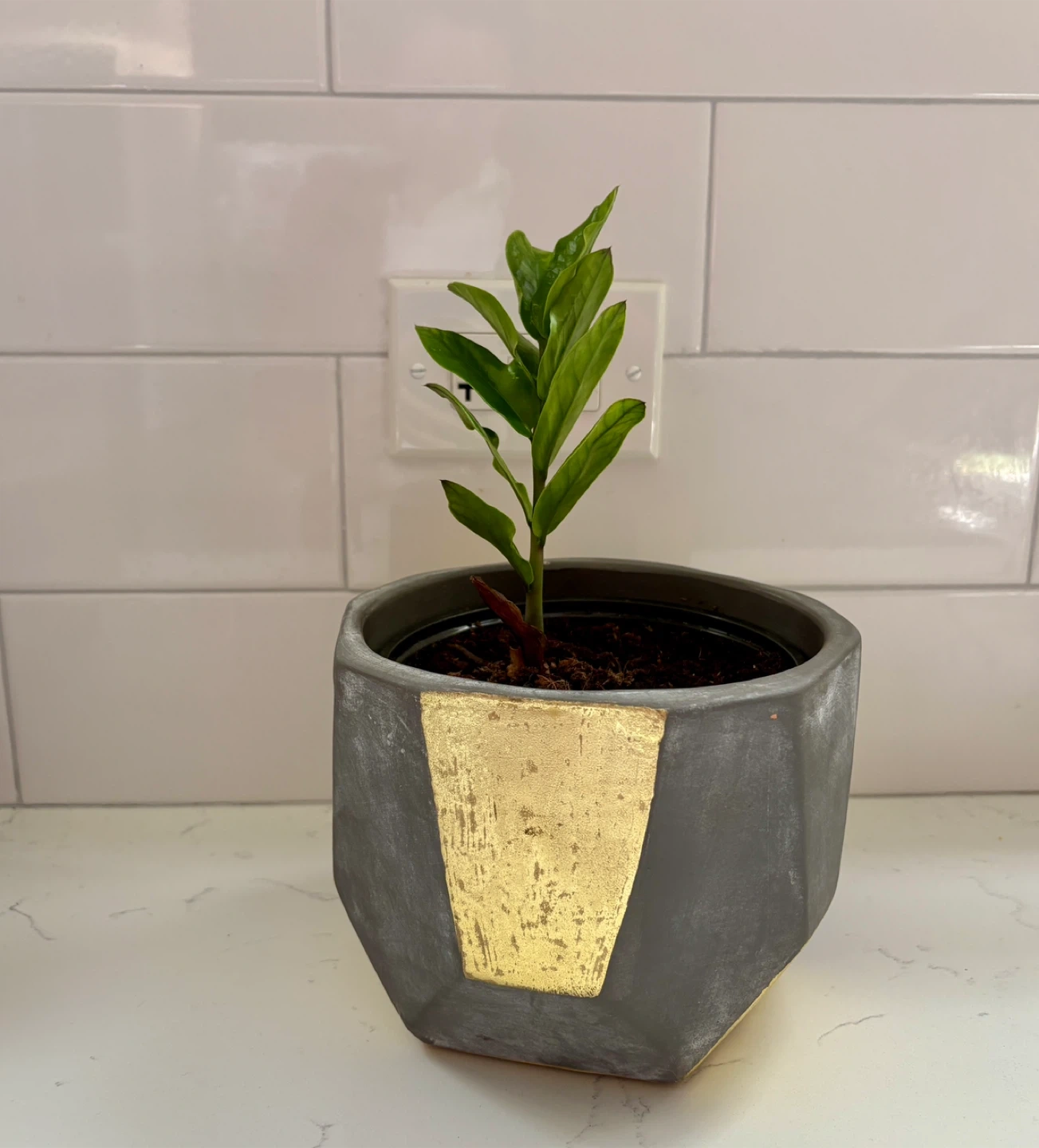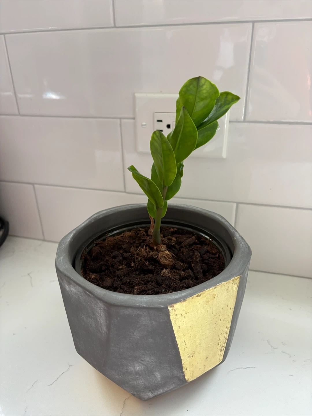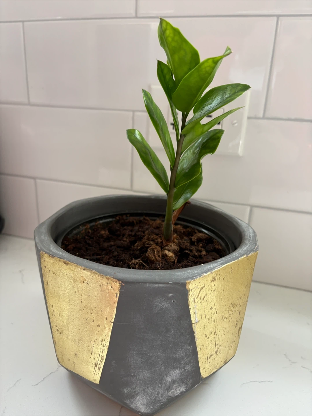 Selling a healthy ZZ plant potted in a stylish gray and gold decorative pot. It's a great way to add some greenery to your space! The plant is easy to care for and perfect for indoor environment.