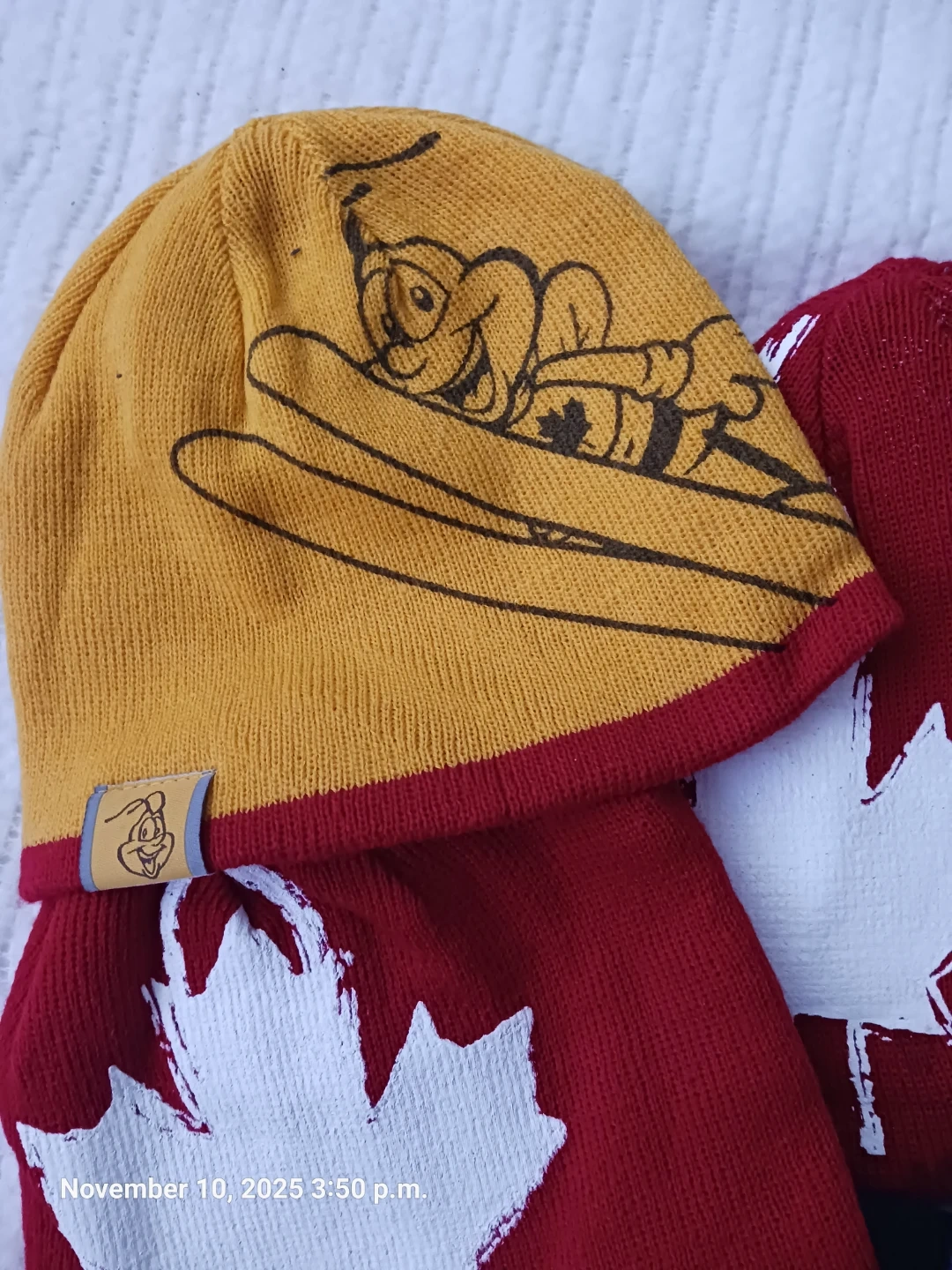 A collection of fun toques! There's a red one with a maple leaf, a black one with a hockey player, a yellow one with a cartoon character, and a Cinnamon Toast Crunch toque