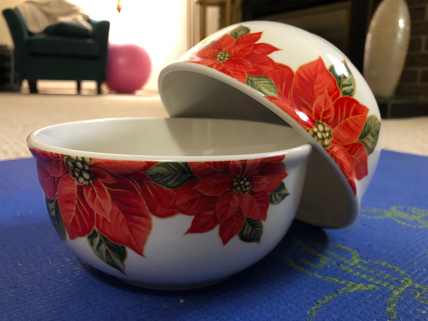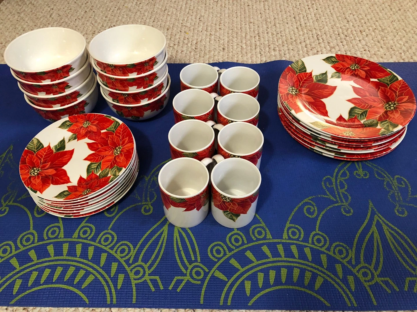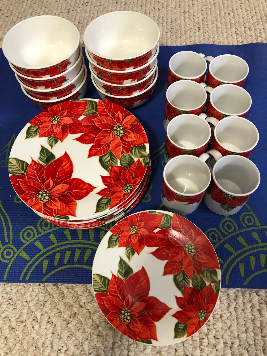 Selling a beautiful poinsettia-themed dinnerware set! Includes plates, bowls, and mugs. Perfect for adding a festive touch to your dining table during the holidays