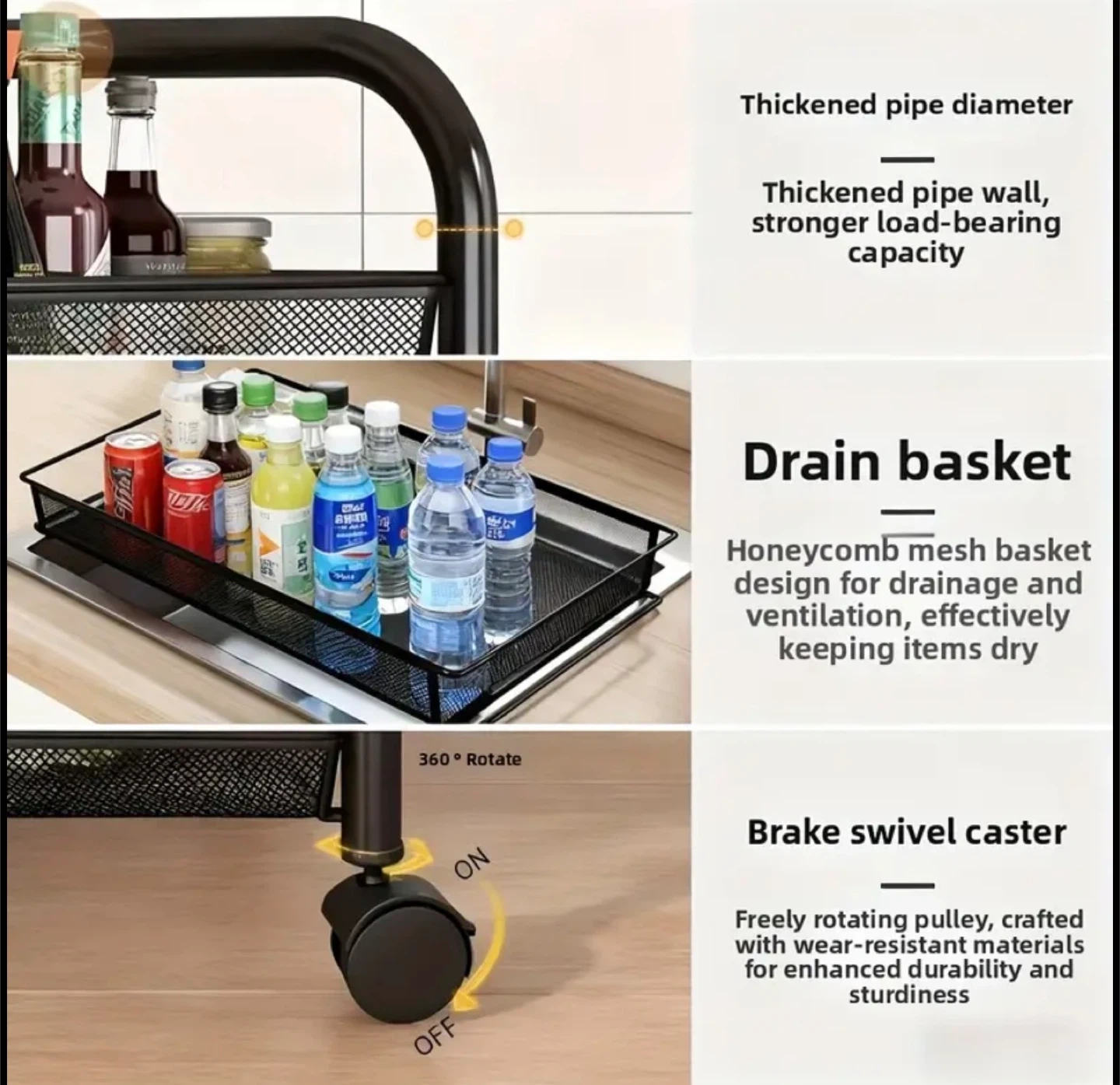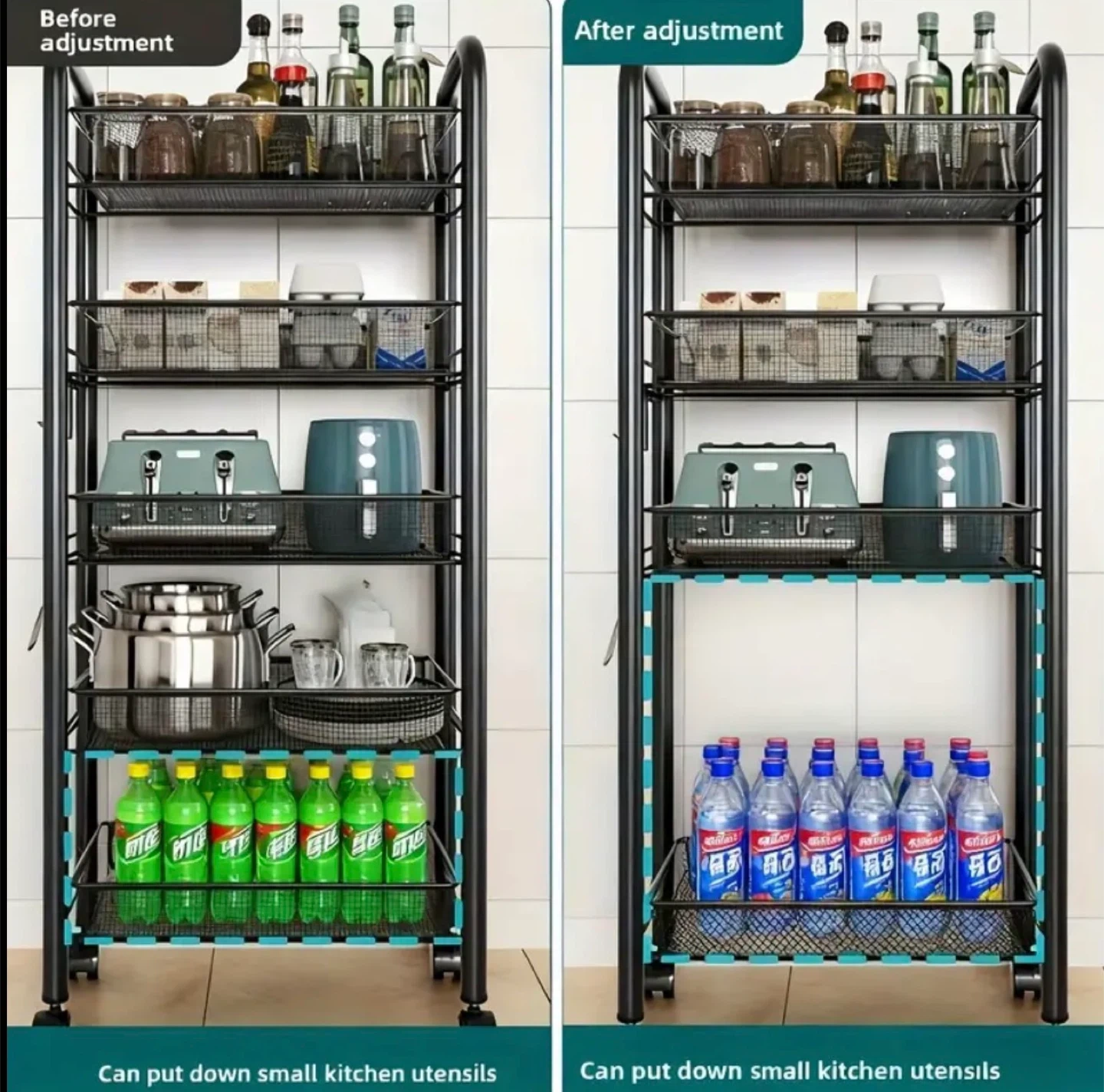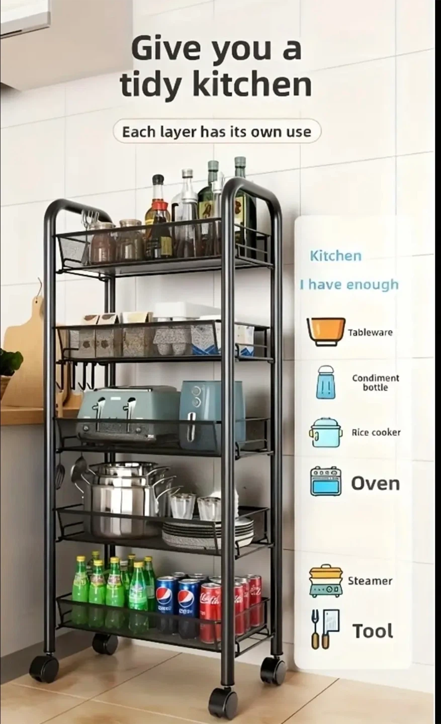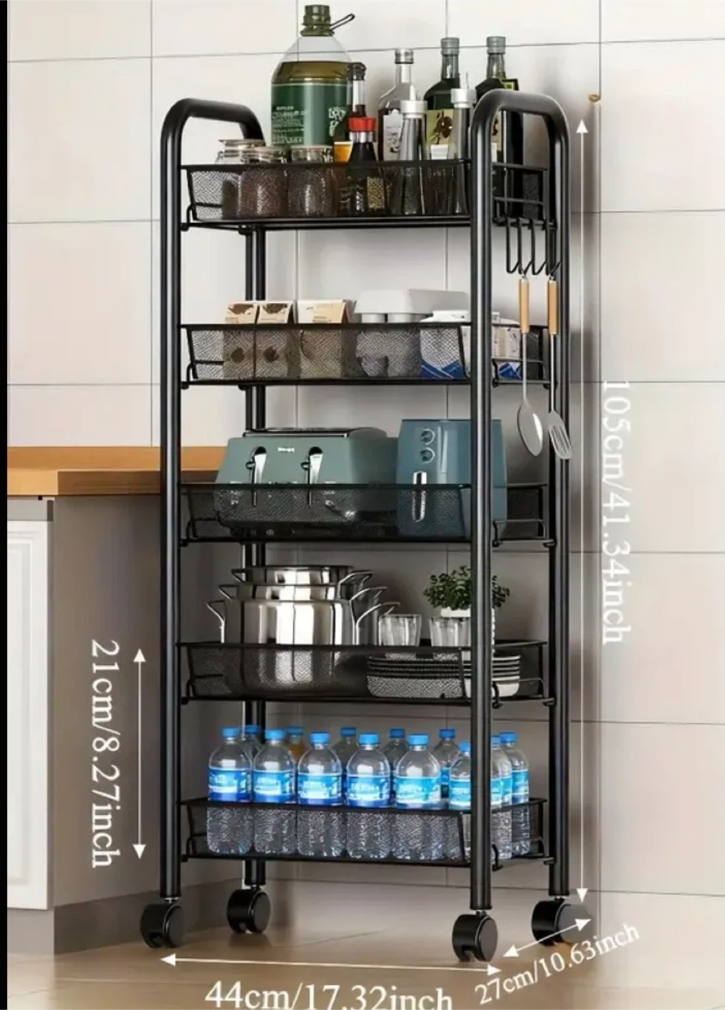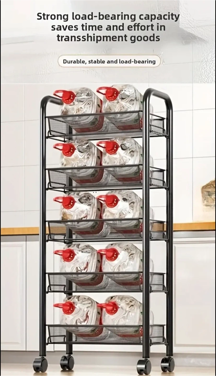 This rolling kitchen cart is perfect for adding extra storage to your kitchen or pantry! It features multiple tiers of wire baskets, great for organizing everything from produce to cookware. The cart is on wheels, so it's easy to move around as needed. Adjustable shelves. Two colours available: Black and White.