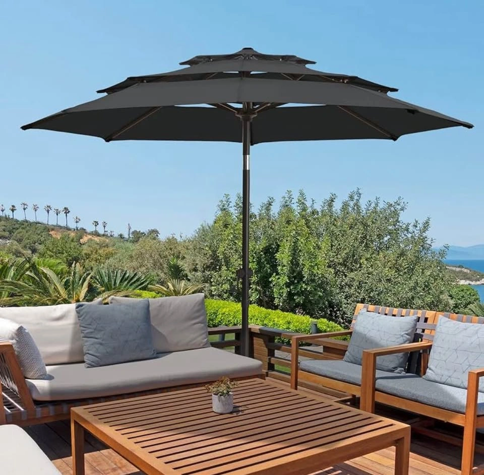 Stay cool and stylish with this HOMSHADE 9FT 3-Tier Patio Umbrella in elegant dark gray.