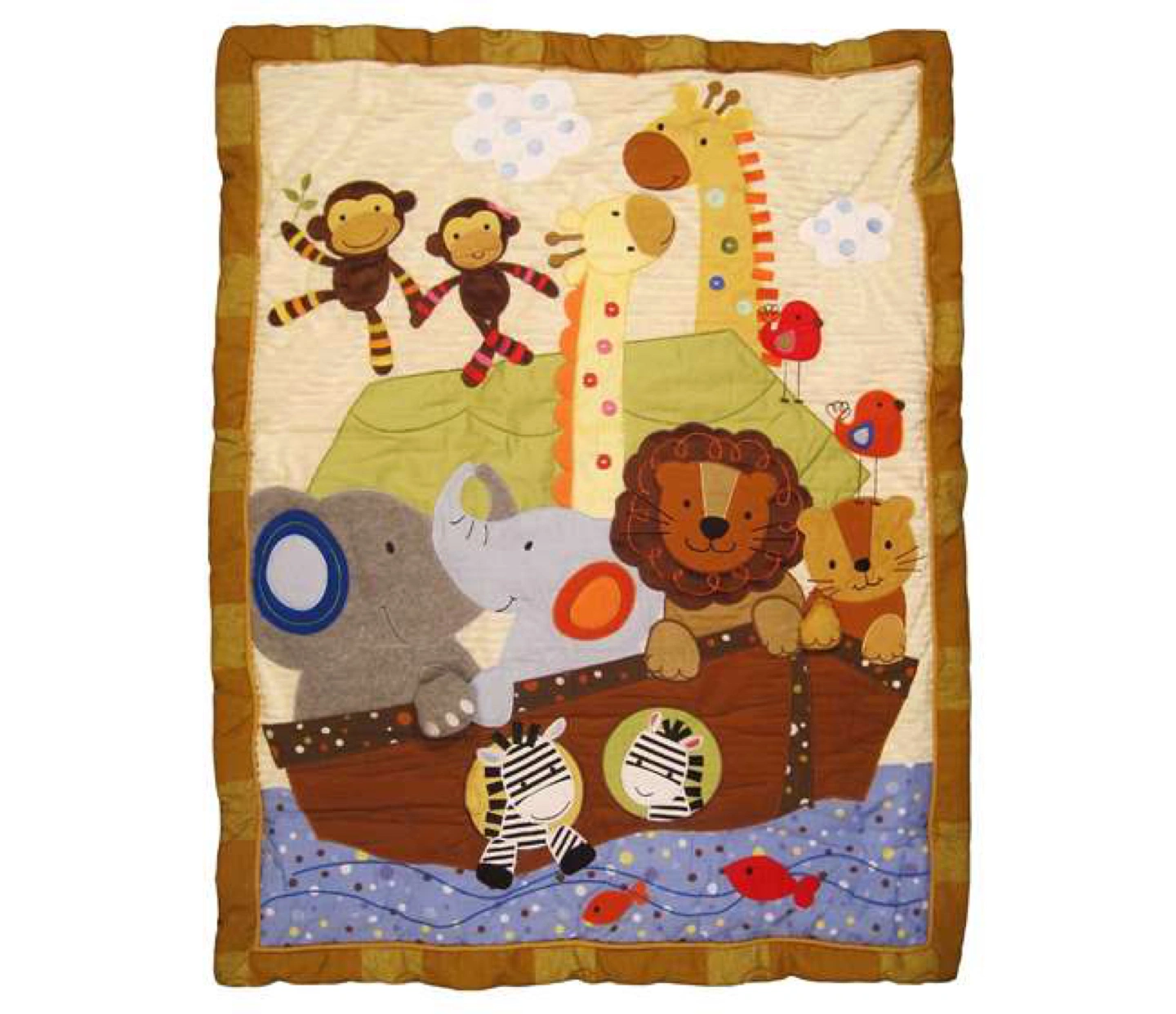 1) Quilt measures 44"L x 35"W and features fun graphics of animal pairs on a boat, including lions and elephants with 3D paws, against a soft striped background