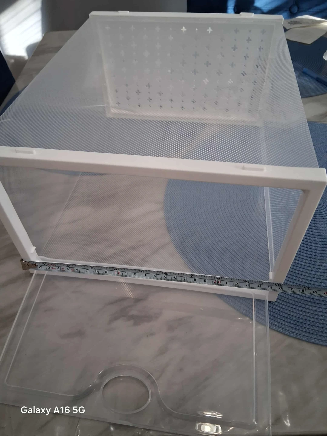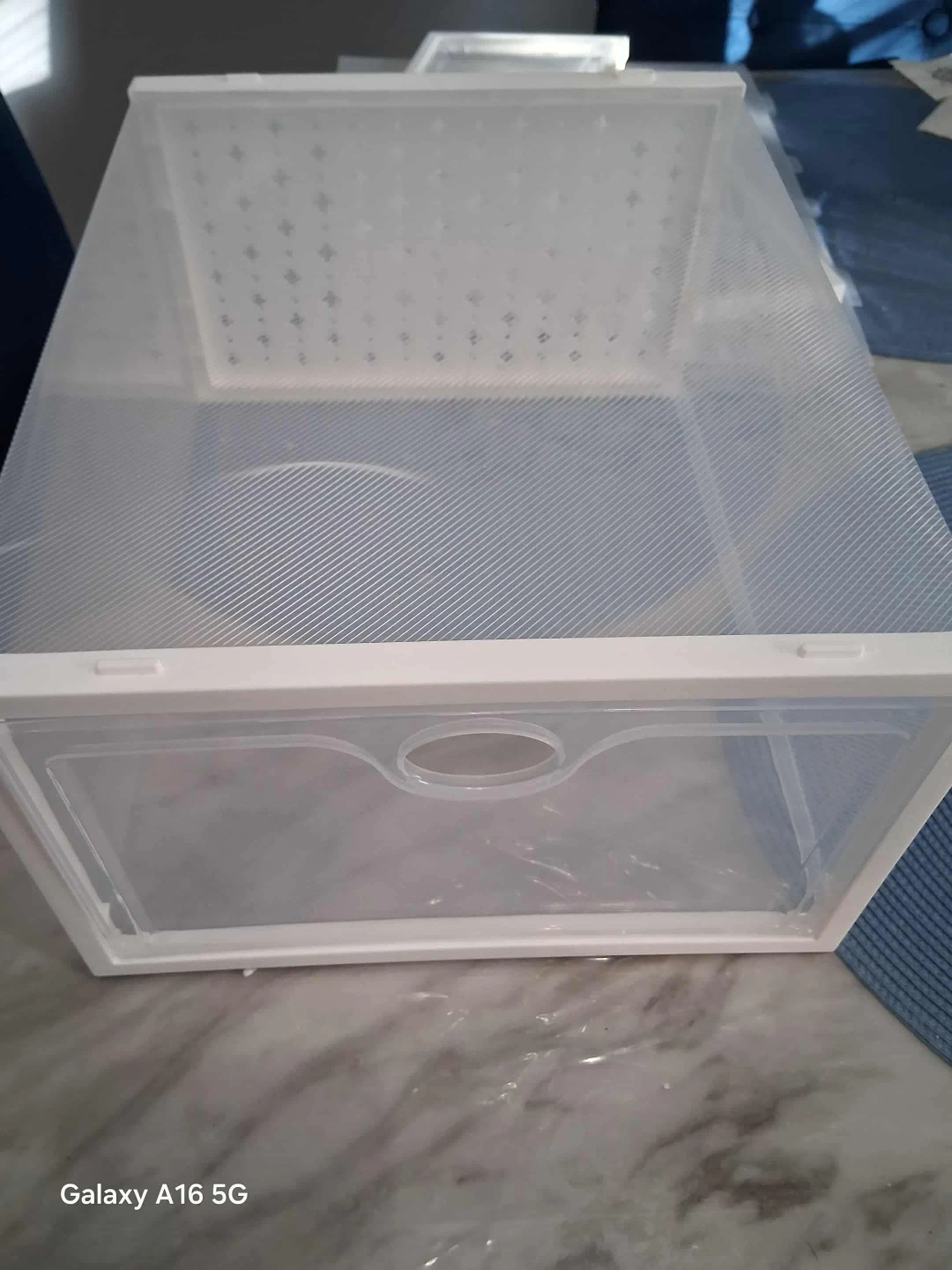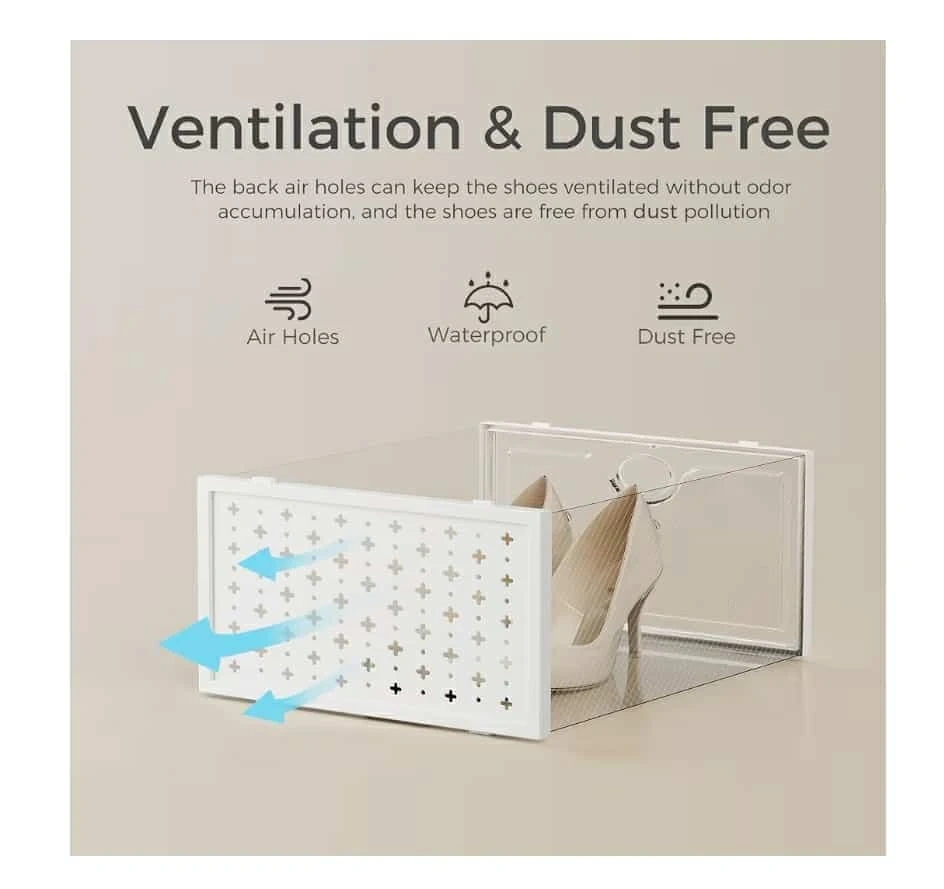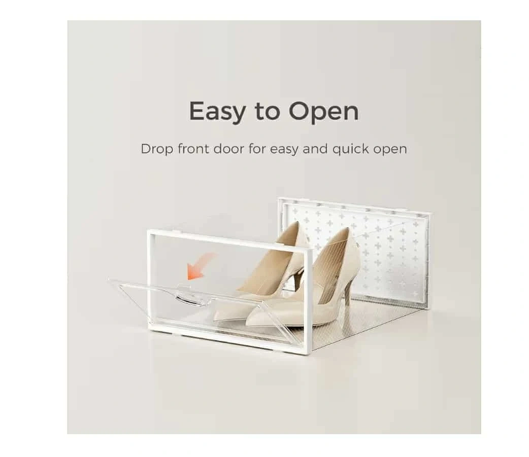 Keep your shoes organized and dust-free with this clear stackable shoe box! It features a drop-front door for easy access and ventilation holes to prevent odor accumulation. The dimensions are approximately 13 inches in length, 9 inches in width, and 6 inches in height.