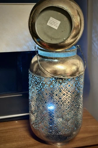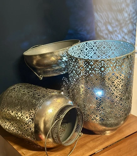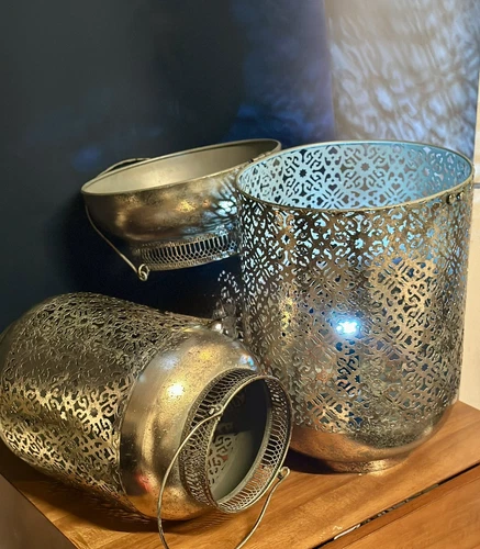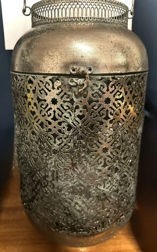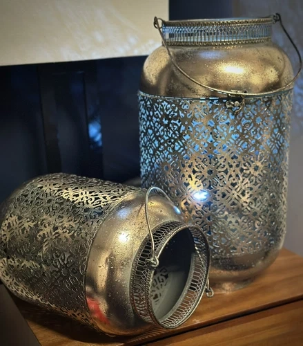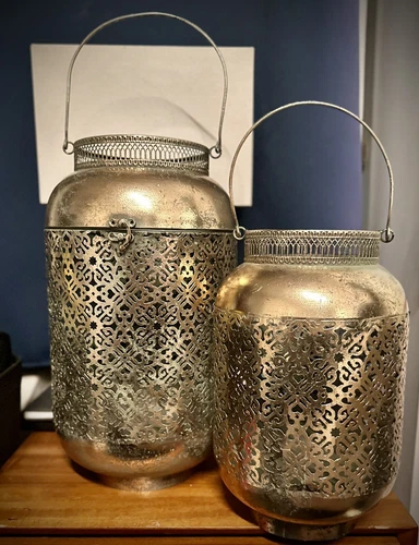 Inspired by the mystery and romance of far away places, this 2 piece Moroccan metal lantern set offers practical features and intricate paisley embossing and perforated dot detailing that lets beautiful candle light shine through. Made by hand. Crafted of metal with a whisper of white patina, these tall golden lanterns feature swing latches, hinges, and elegant cylinder shaped body that is comprised of intricately detailed lattice work. Well sized, each piece in the set measures as follows: 10.25 D x 17.75 H inches, 3.25 lbs. and 7.75 D x 13 H inches, 1.5 lbs. Create amazing ambiance at home by casting shadows and light from the flickering glow of candles placed within. Easy to store. When not in use, these candle lanterns can be placed inside each other for convenient storage. While ideal for outdoor use in the garden or on the deck, we do not suggest that they stay outside during inclement weather. Always a welcome gift.