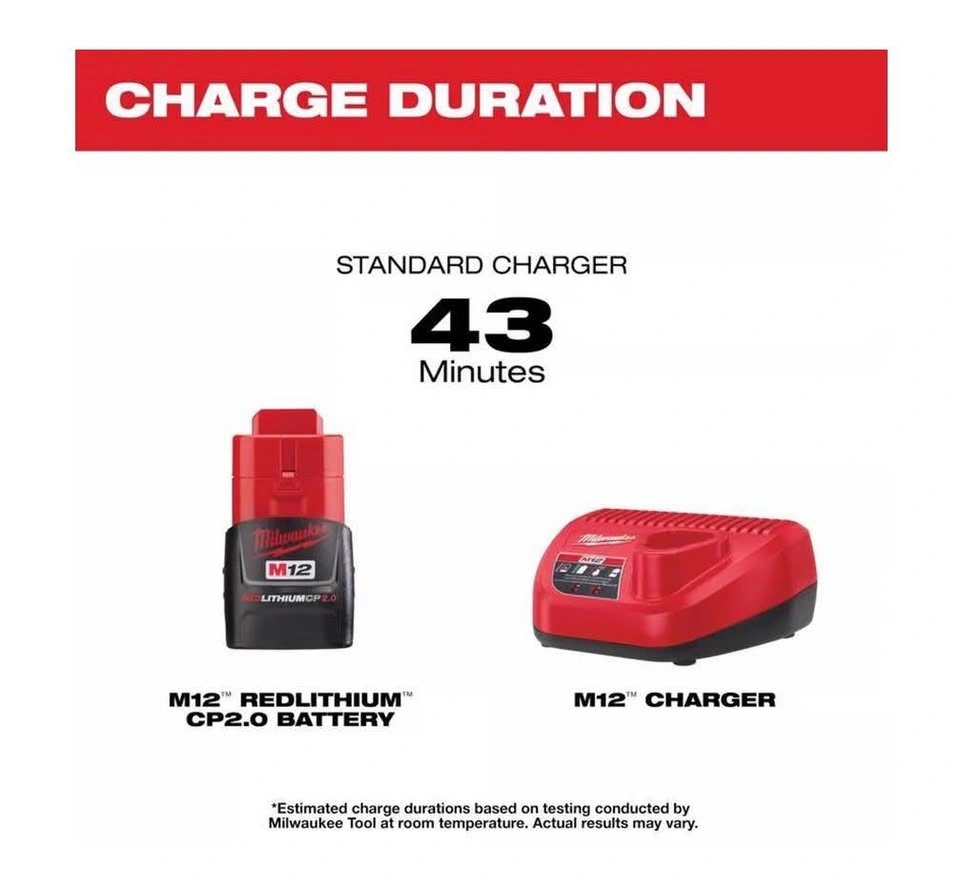 The Milwaukee M12 Charger accepts all M12 batteries. Power up compact batteries in 30 minutes and extended capacity batteries in 60 minutes. The Milwaukee 48-11-2420 M12 Redlithium 2.0 provides up to 2X more run-time, 20% more power and 2X more recharges than a standard Lithium-Ion battery. Redlithium 2.0 delivers best-in-class performance in extreme job-site conditions and operates cooler in climates below -18 deg. C/0 deg. F with fade free power. Add to any M12 bare tool to create your own tool kit. M12 RedLithium battery packs delivers long life and run time with fade-free power. Battery fuel gauge displays charge status on tool. M12 charger offers recharge-statues light indicators and an easy-to-load design. Small and easy to carry, making it perfect for use on the go.