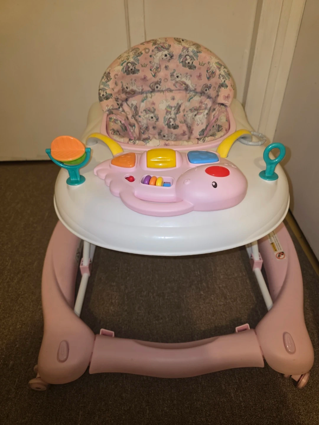 Selling a baby walker in good condition! It's pink and has a cute design on the seat. Perfect for little ones learning to walk and explore