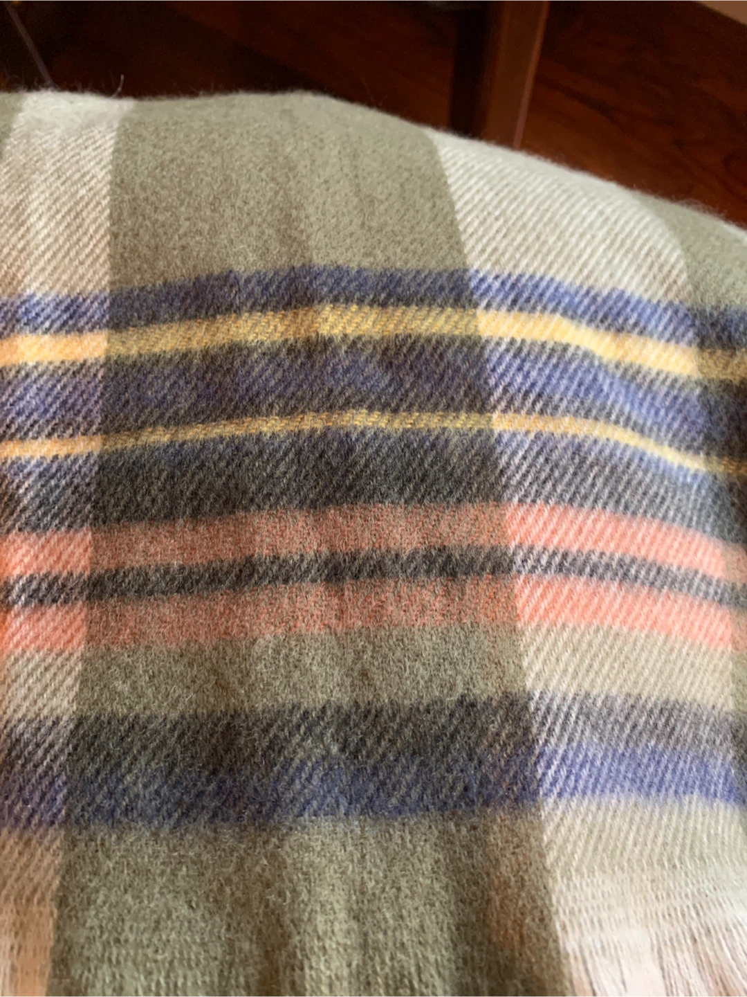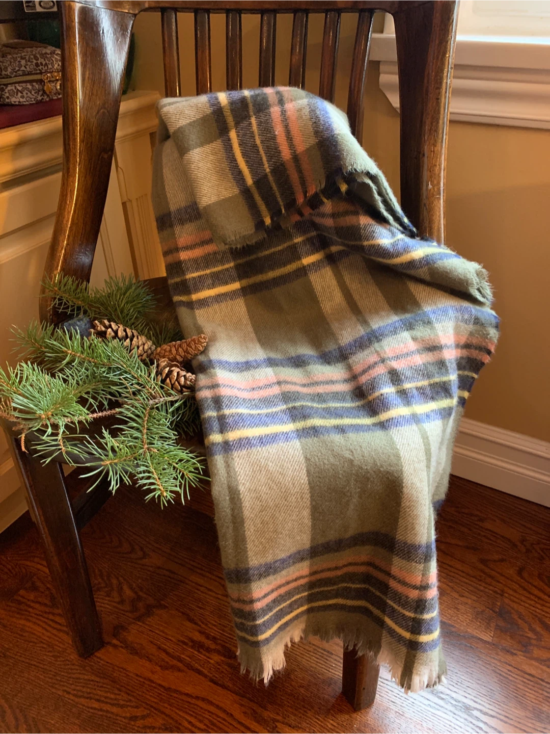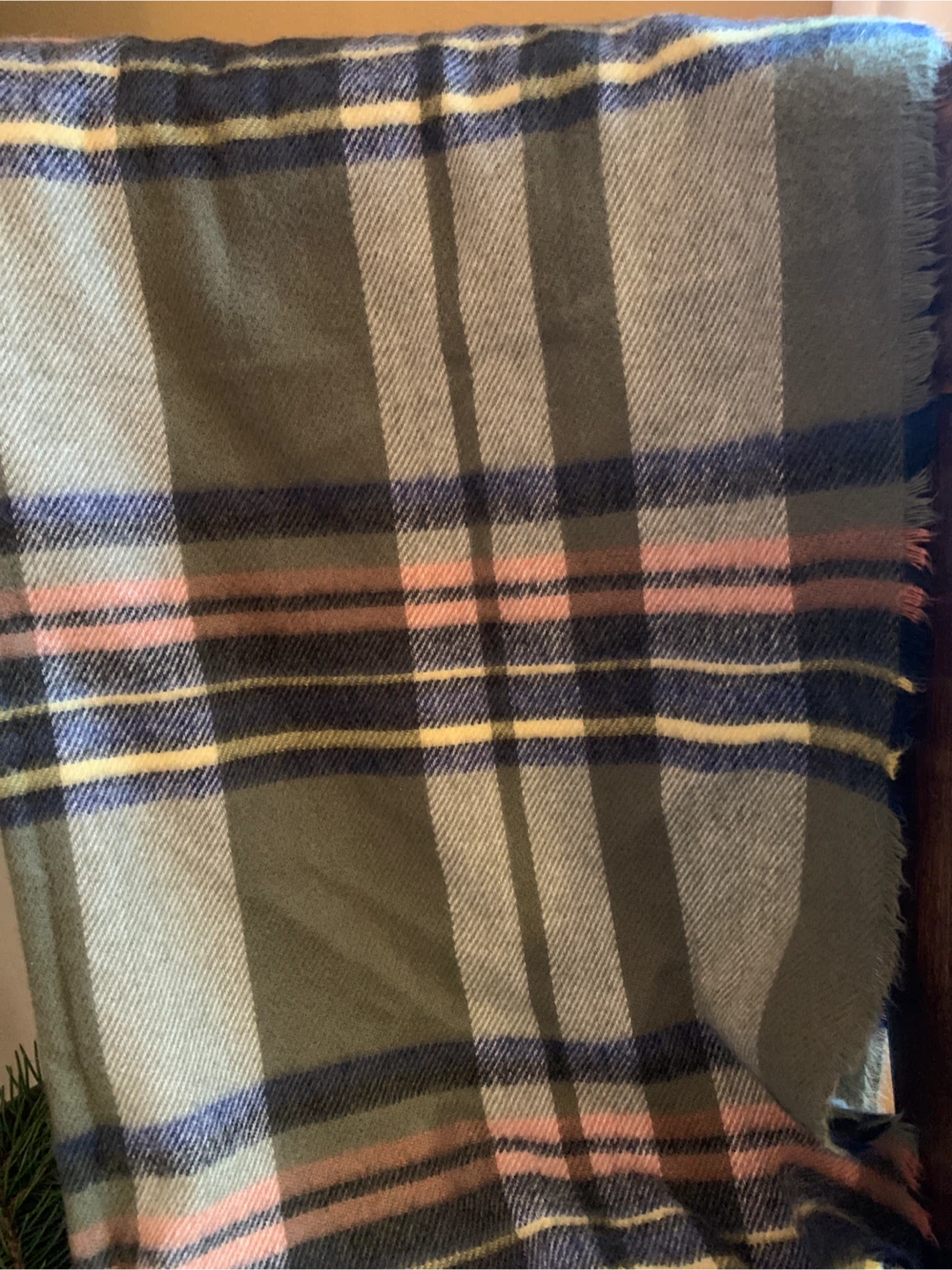 It features a lovely plaid pattern with olive green, navy blue, yellow, and pink colours. It’s giving Ralph Lauren vibes! It is in excellent condition and is made of recycled poly which is so soft. Perfect for adding a touch of warmth and style to you on a cold day!