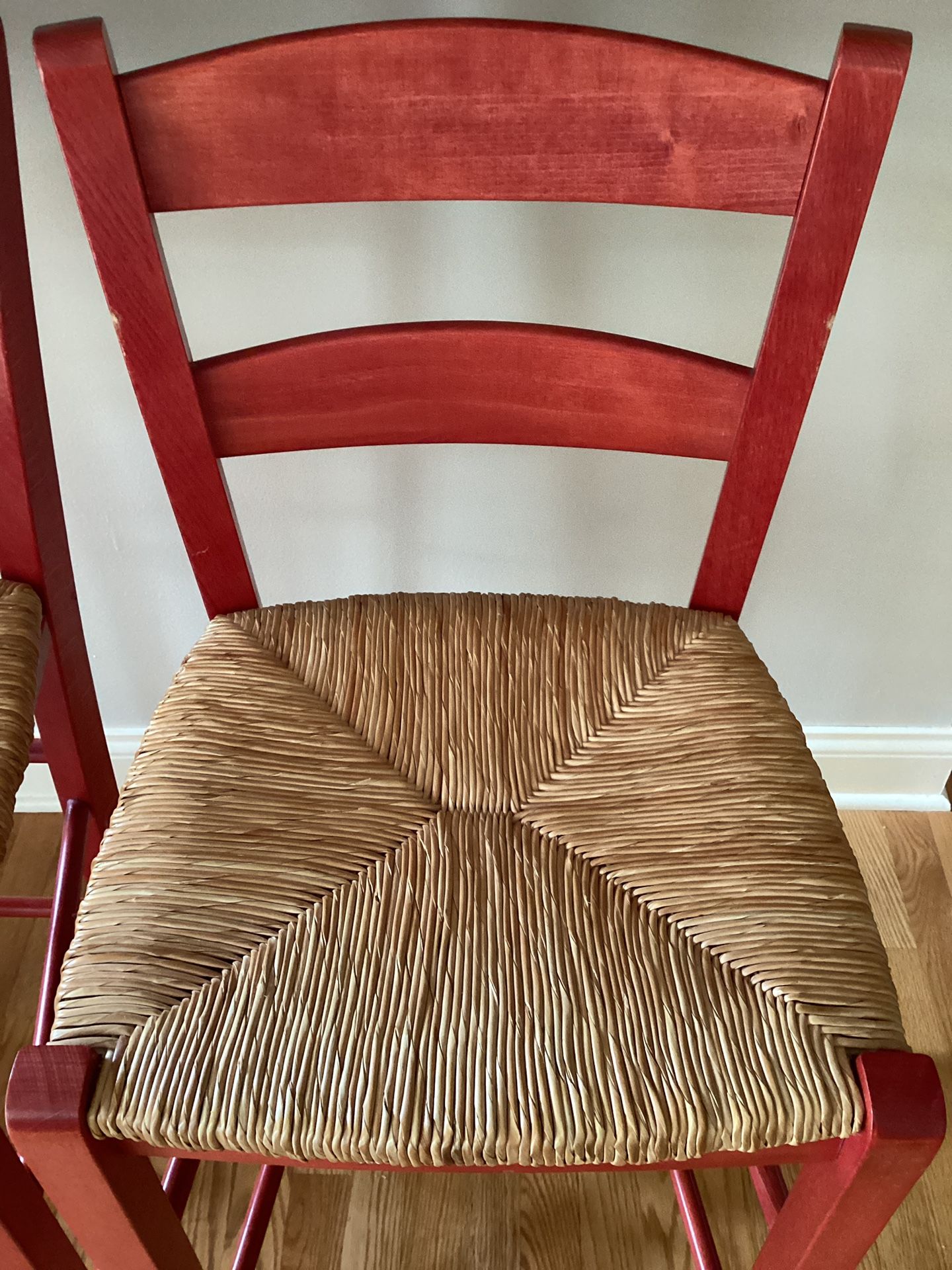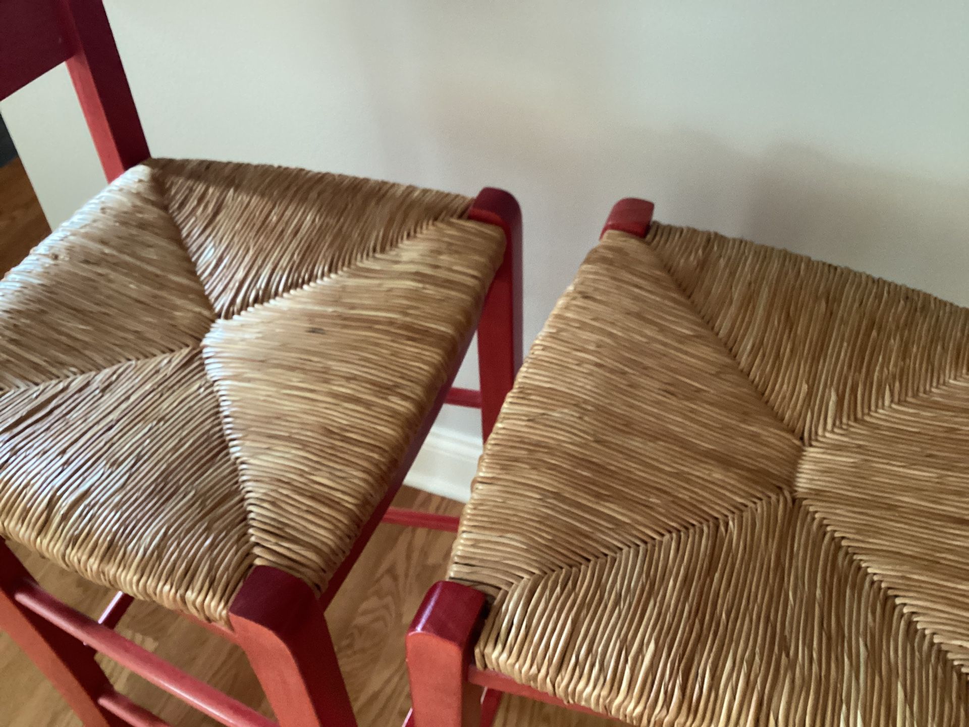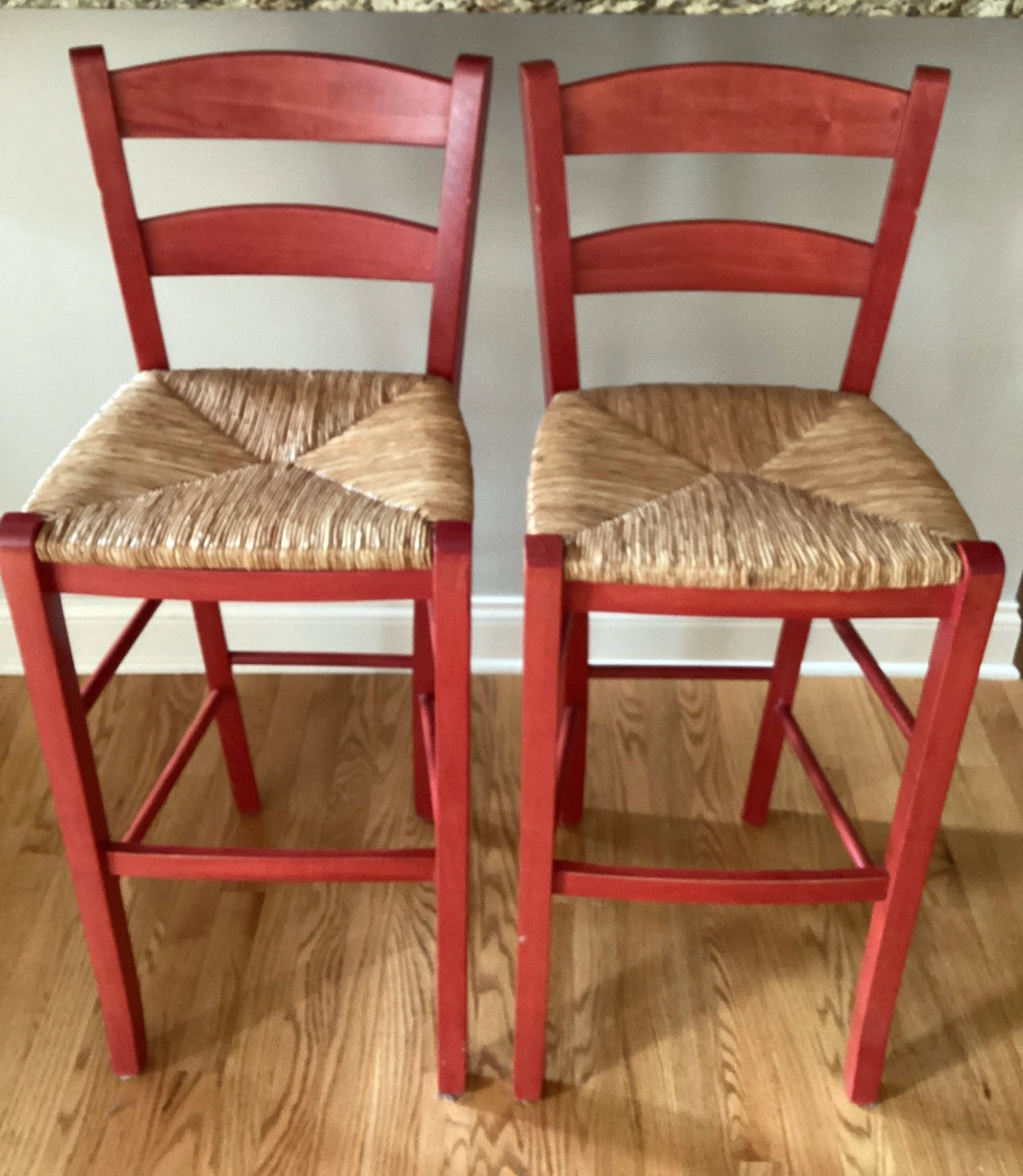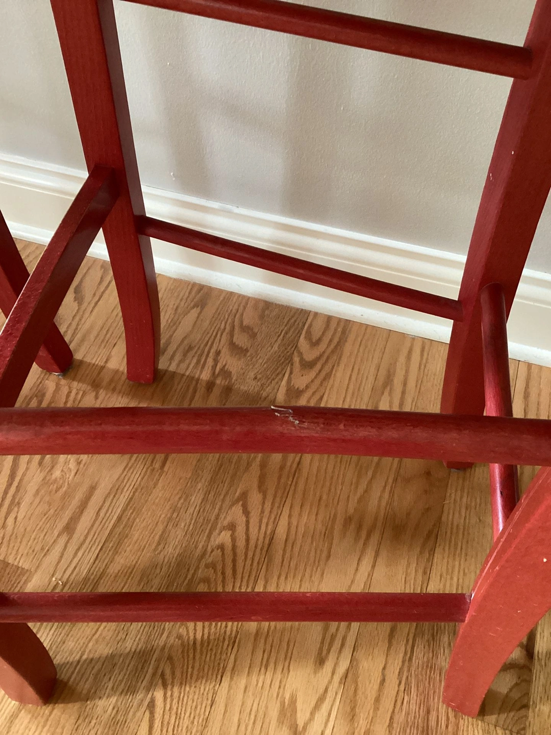 In good condition but on one chair, the wood is chipped a little on the right upper side beam (see photo). The stool is still sturdy and safe to sit on.