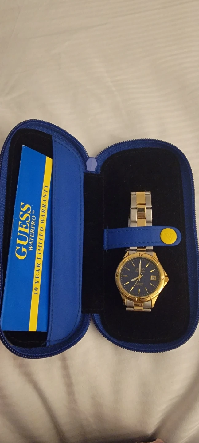 Selling a Guess Waterpro watch that comes with its original case and a 10-year limited warranty. The watch features a two-tone design with a gold and silver band and a blue face. It's in great condition and ready for a new owner! The case is also in excellent shape, making it perfect for storage or travel