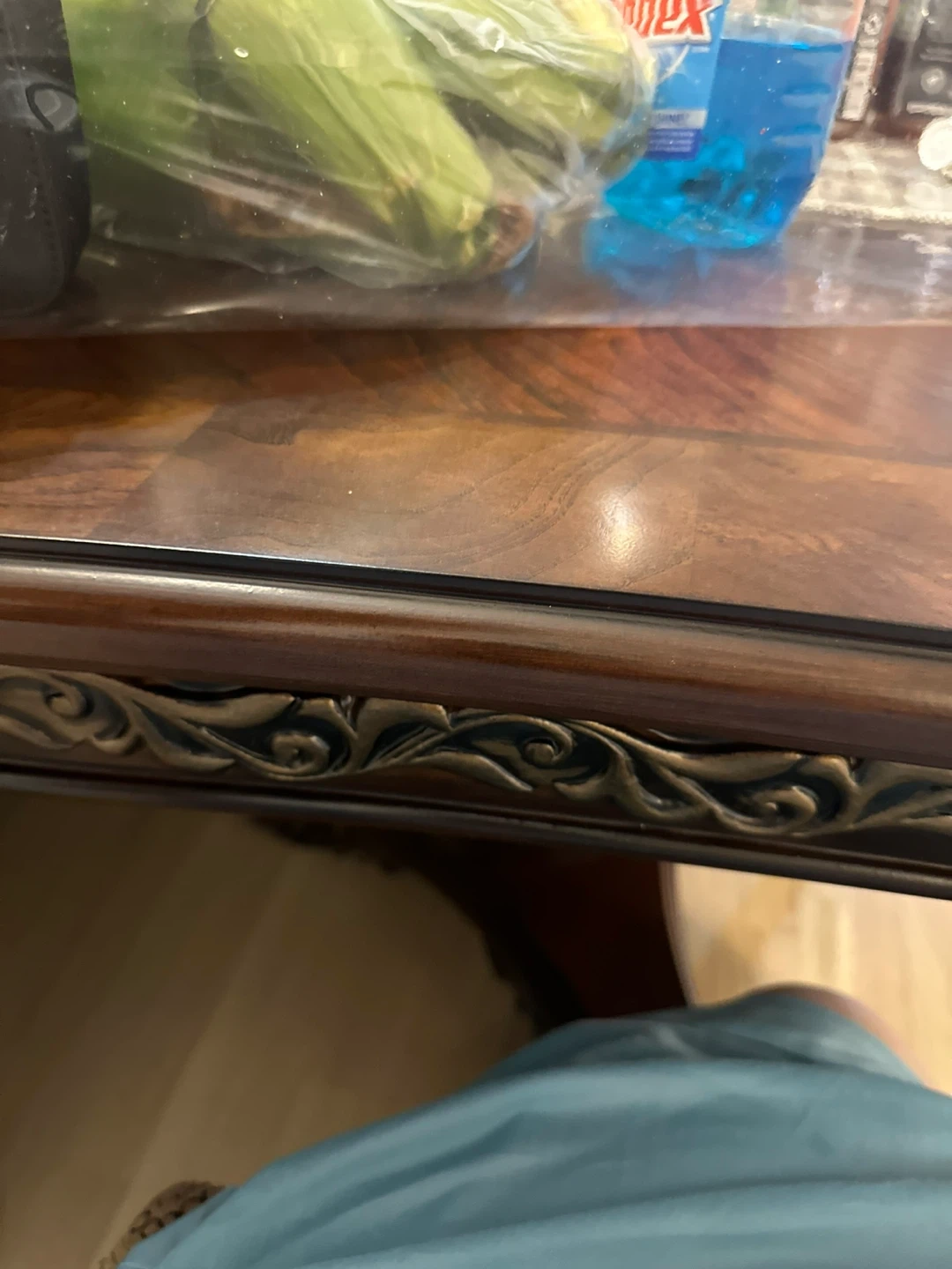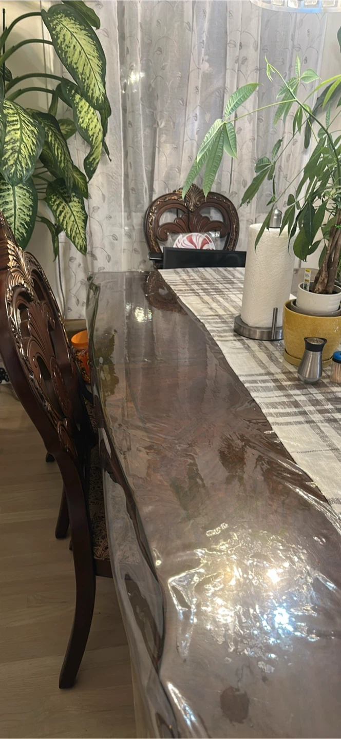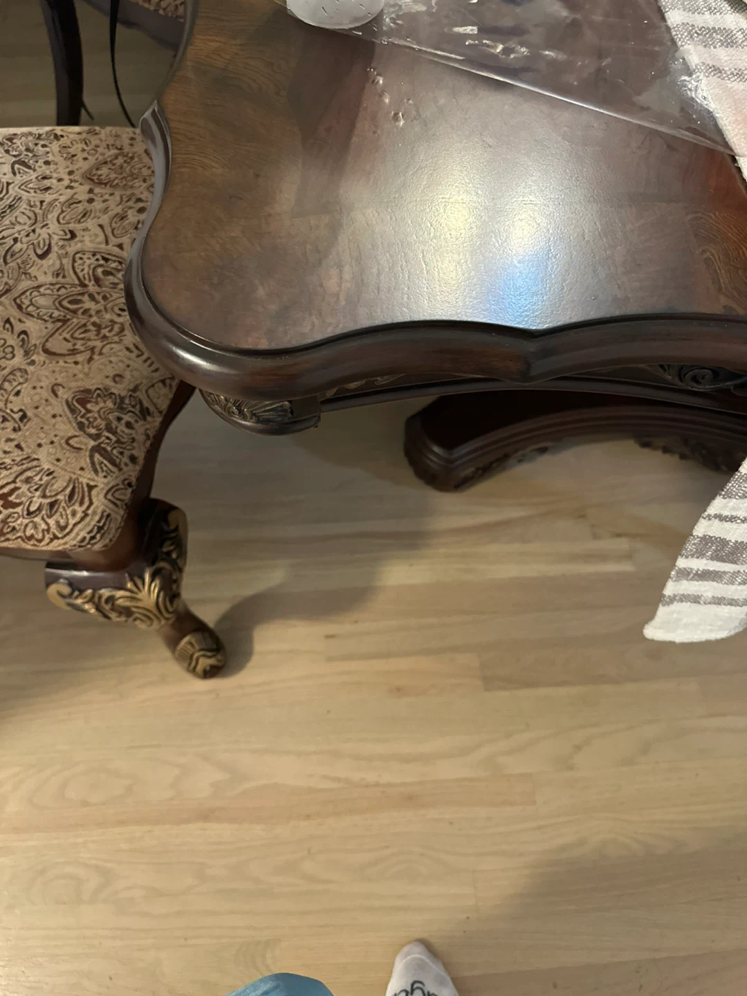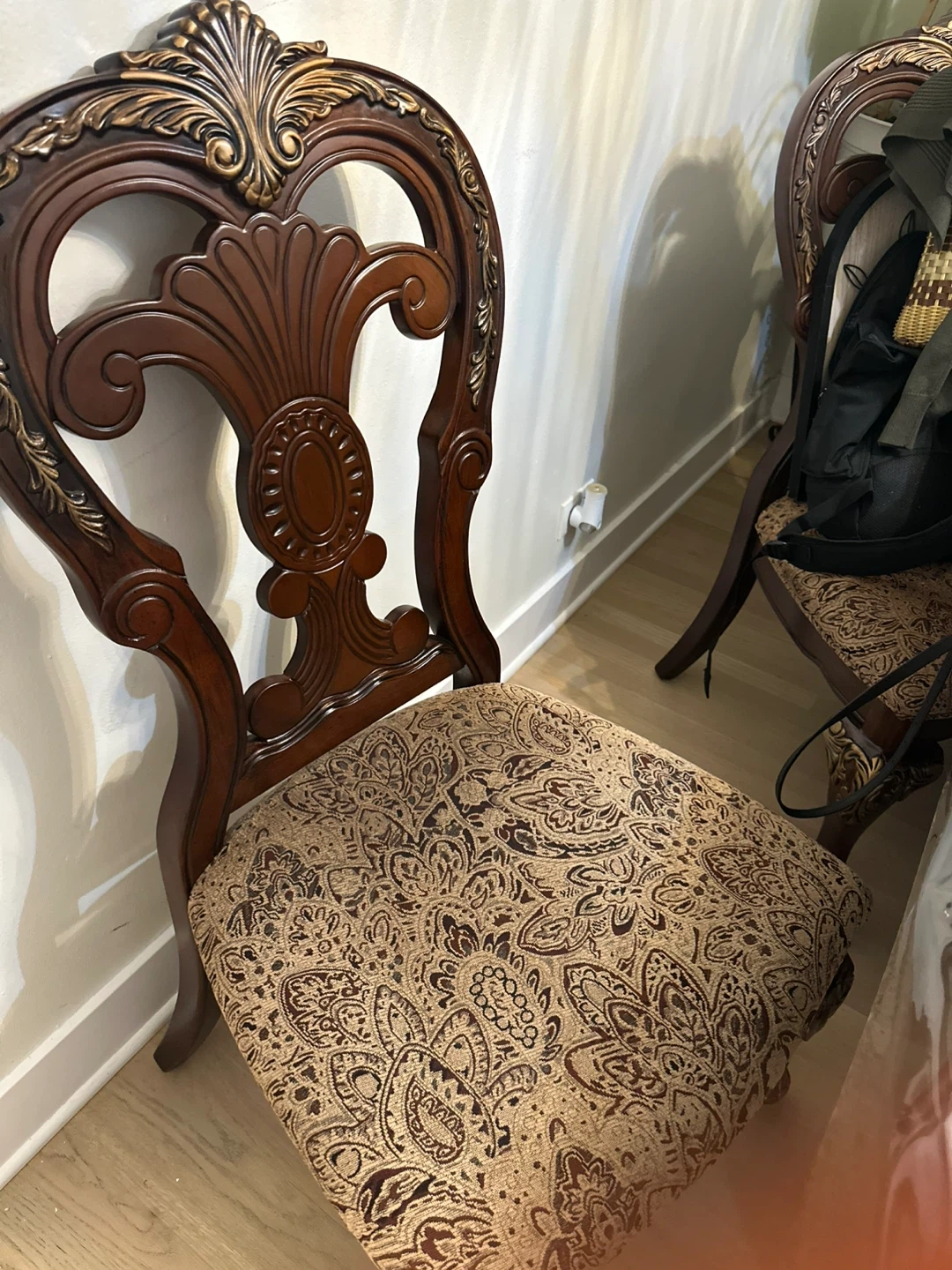 Selling a beautiful antique dining table and chairs set. The table features a dark wood finish with ornate detailing. The chairs have patterned upholstery and matching wood frames. A stunning addition to any dining room!