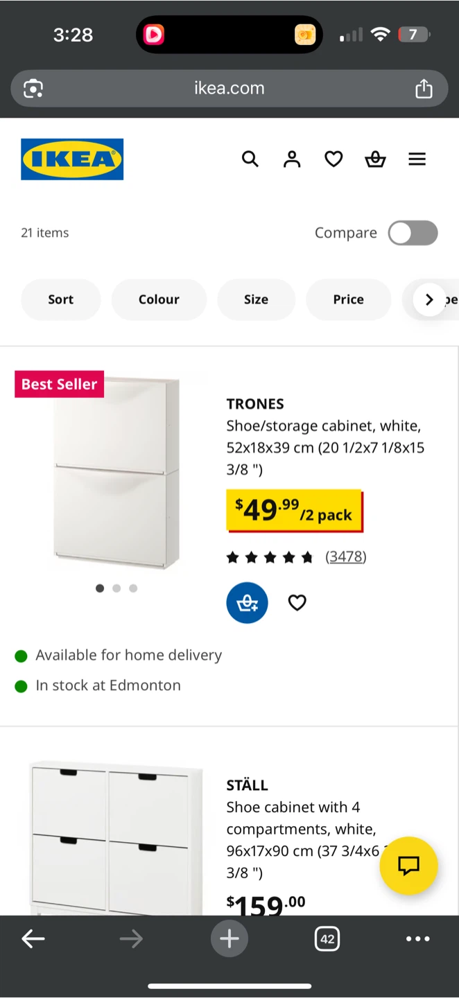Selling an IKEA Trones shoe/storage cabinet in white! It's a best seller and great for organizing your space. The dimensions are 52x18x39 cm (20 1/2x7 1/8x15 3/8 "). Originally, it was $49.99 for a pack of two
