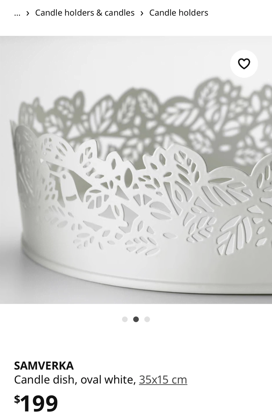 1 / 31 / 3Buy & SellSAMVERKA Oval White, 35x15 cmSAMVERKA Oval White, 35x15 cm$17This is a SAMVERKA candle dish in oval white with dimensions of 35x15 cm. It's perfect for adding a touch of elegance to your home decorWHERE TO MEET95 Wood StView MapSELLERverifiedSunnyGarden District88690 reviews0 chats·0 favorites·9 viewsSEND CHAT TO SELLERHi Sunny! I’m interested in your listing.Hi Sunny! I’m interested in your listing.Get the Karrot app to chatSign In to chat