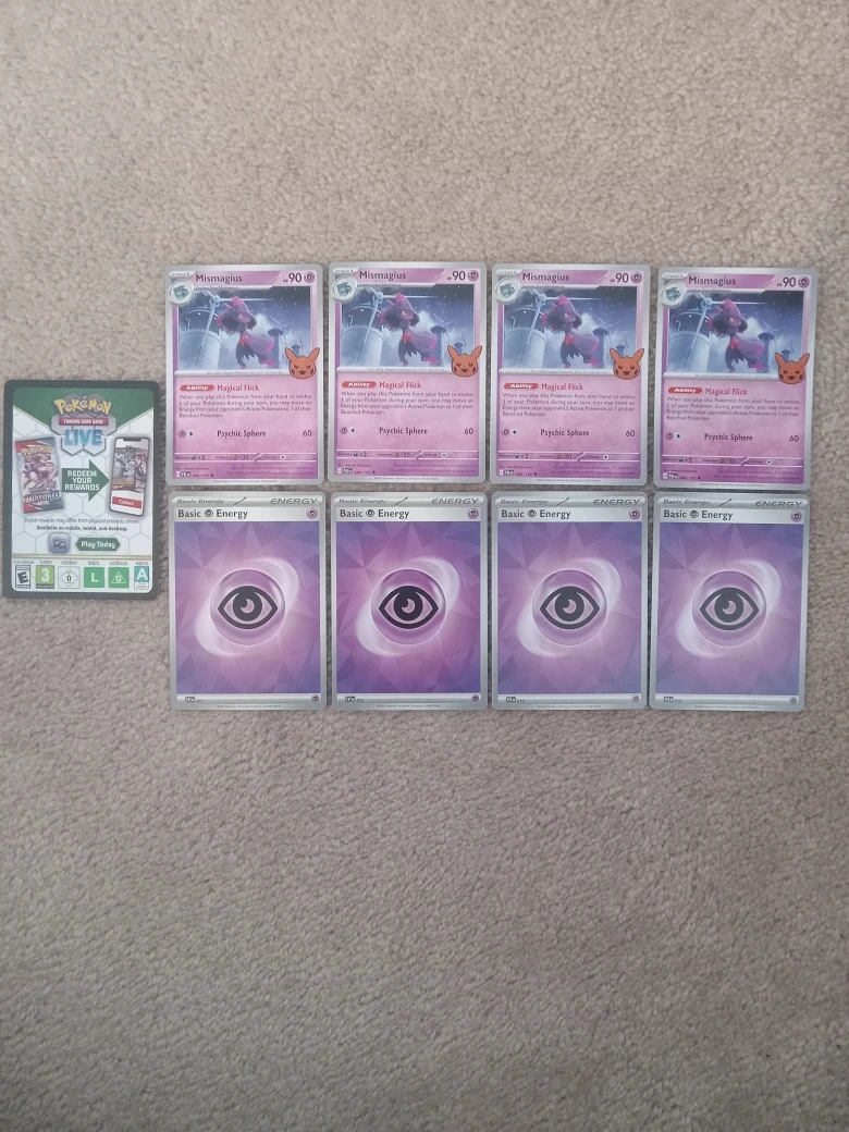 Selling a playset of ×4 Mismagius pokemon cards from the 2023 Trick or Trade Set; also includes ×4 Psychic Energy cards to get started.
