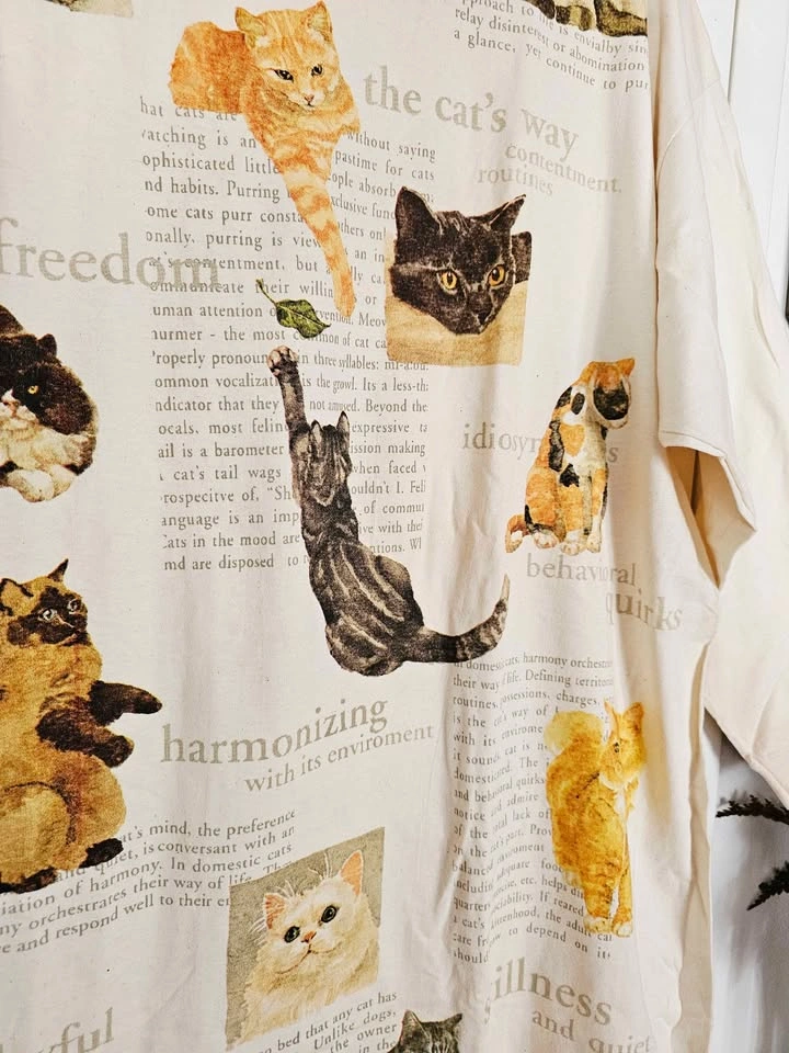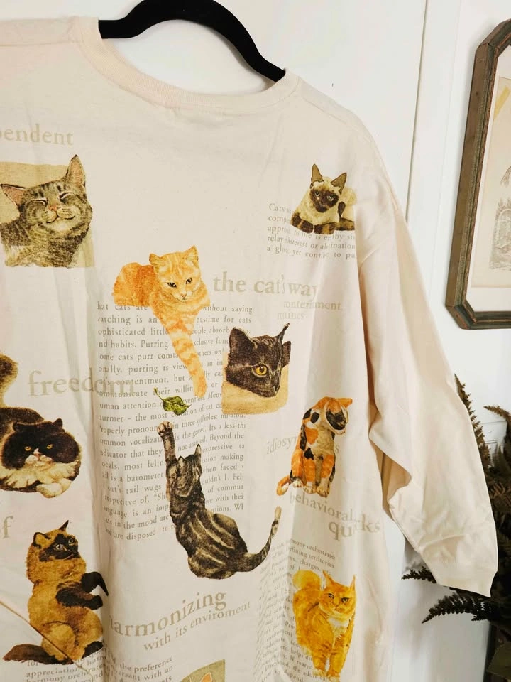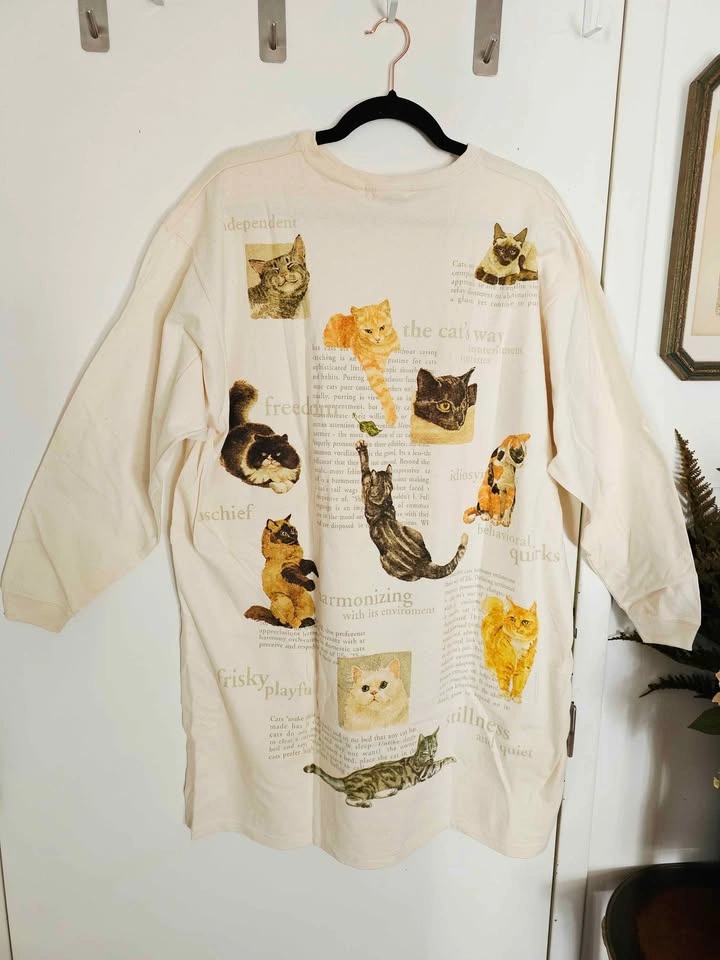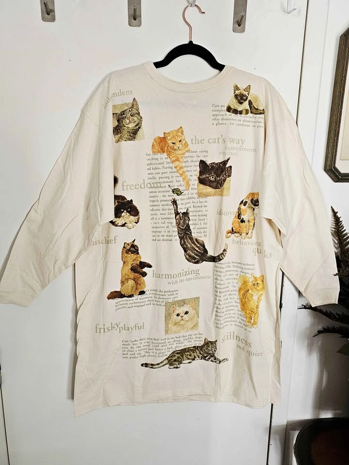 Amazing vintage long sleeve oversized shirt or shirt dress from the 90s, lovingly referred to as the 'crazy cat lady' print! It is a cream/ off-white color and features an all-over print of adorable cats, with assorted cat facts and descriptions. It can be worn as a long shirt or a mini dress, based on your preference. The date is hard to make out but it appears to say 1998. Perfect for any cat lover!