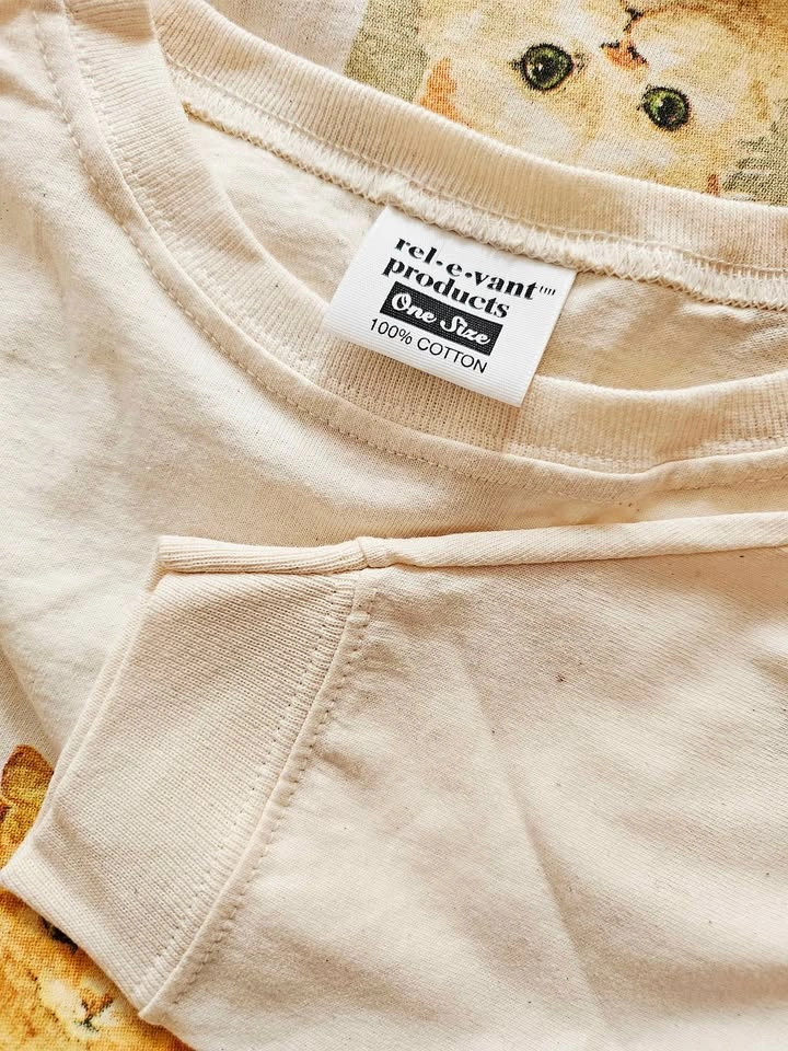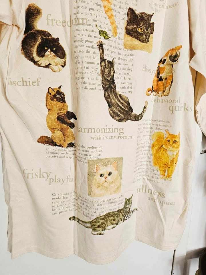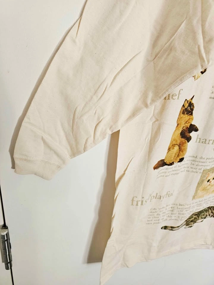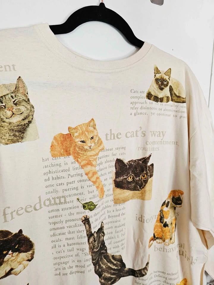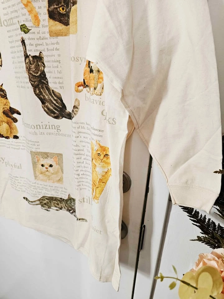 Amazing vintage long sleeve oversized shirt or shirt dress from the 90s, lovingly referred to as the 'crazy cat lady' print! It is a cream/ off-white color and features an all-over print of adorable cats, with assorted cat facts and descriptions. It can be worn as a long shirt or a mini dress, based on your preference. The date is hard to make out but it appears to say 1998. Perfect for any cat lover!