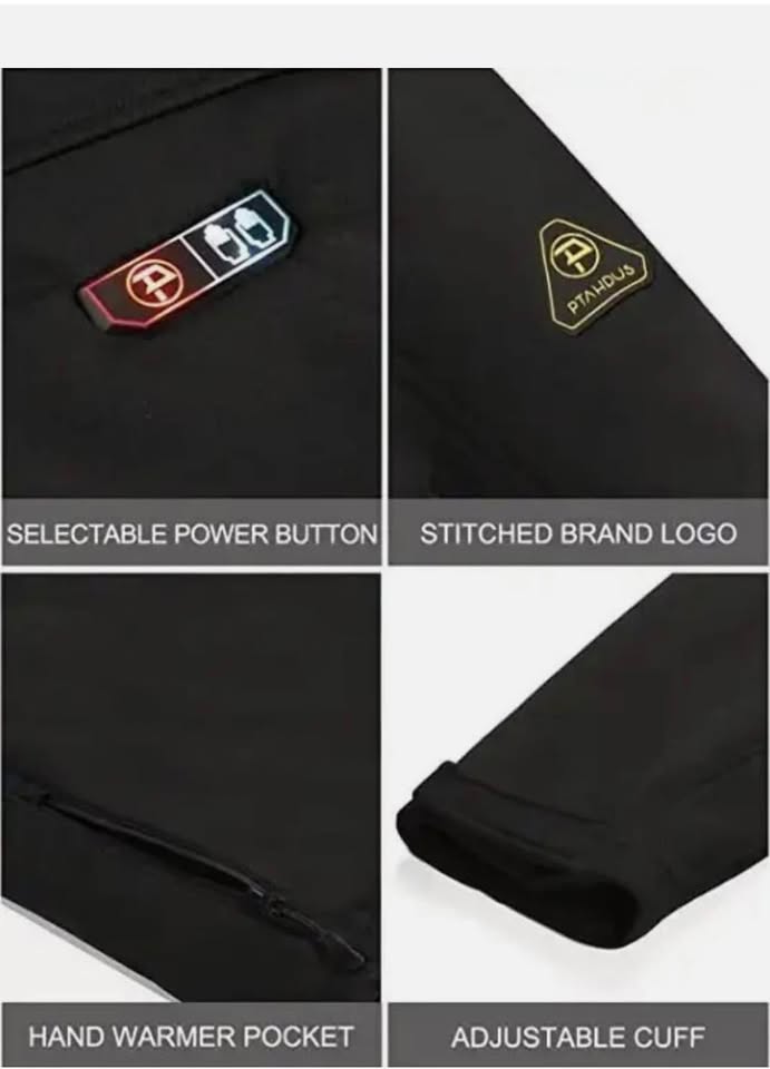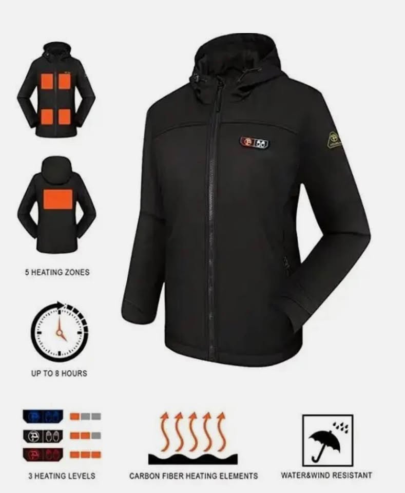 It has 5 heating zones with carbon fiber heating elements powered by Li-battery that distributes warmth to the chest, back, and hand warmers in front pockets. There are two one-press LED controllers to control the hand warmer and body warmer, with 3 heat settings. It heats up quickly and can run up to 8 hours on low. The DWR (durable water repellent) coating strengthens its water resistance and breathability. The inside thickened layer with fleece keeps the heat and blocks the wind.