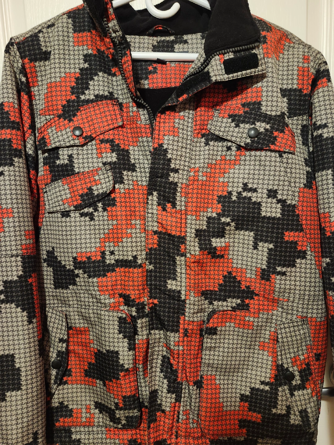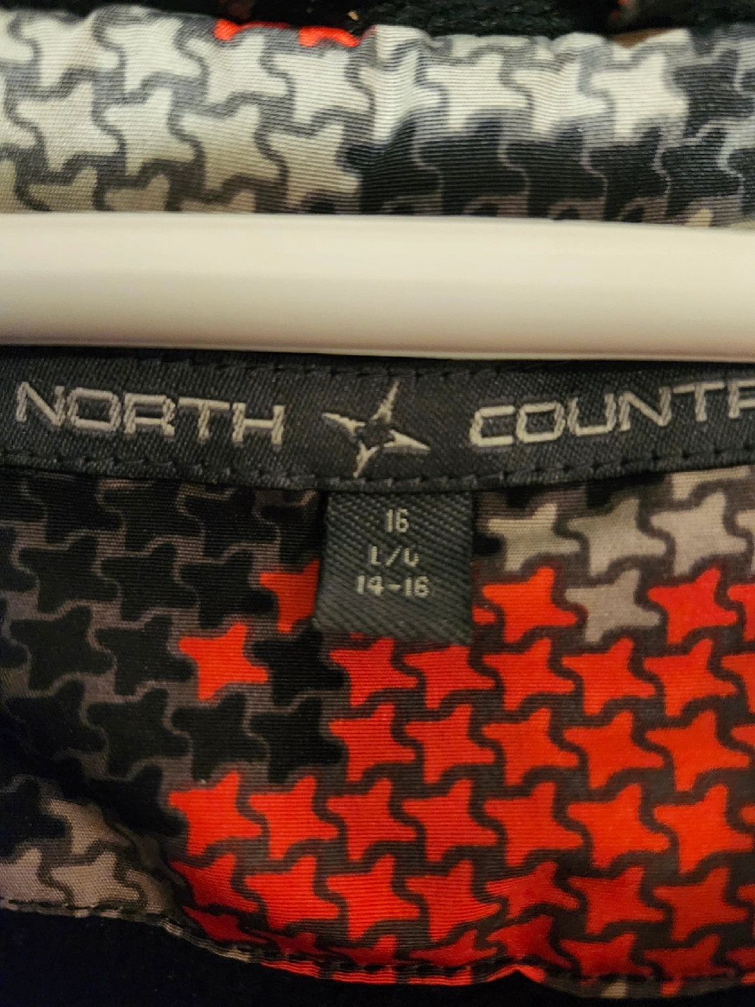 Selling a North Country winter jacket in size L/G (14-16). The jacket features a unique pattern with red, black, and grey colours. It's in great condition and ready for a new home! $15.00