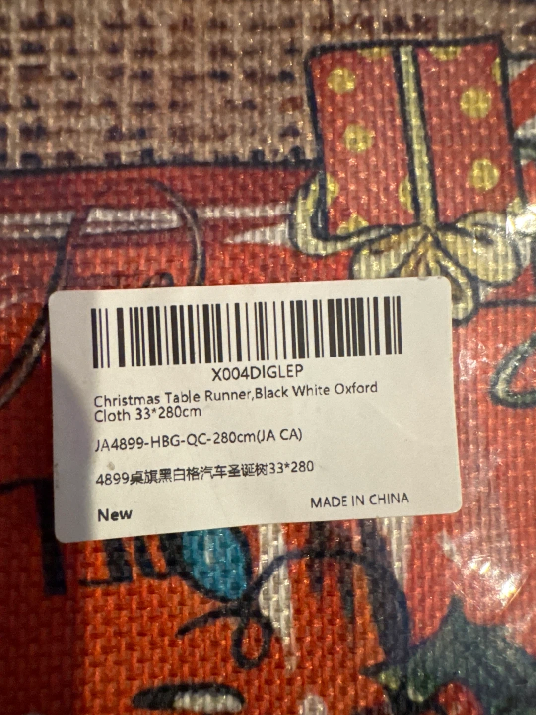 I'm selling a brand new Christmas table runner! It's made of black and white Oxford cloth and measures 33x280cm. It would be perfect for adding a festive touch to your holiday table