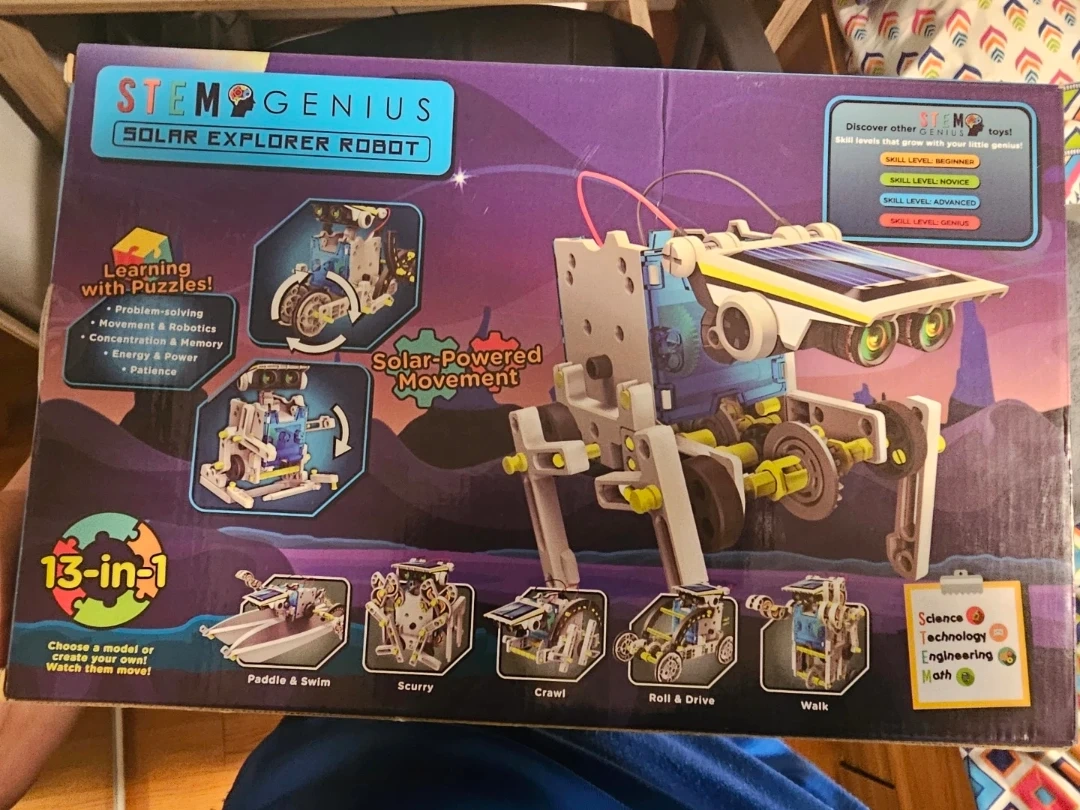 I'm selling a brand new STEM Genius Solar Explorer Robot kit! It's still in its original packaging and contains 190 pieces. This 13-in-1 kit is perfect for kids aged 6+ who are interested in science, technology, engineering, and math. Build robots that walk, roll, paddle, and move using solar power! Never used and I've only ever opened the box once