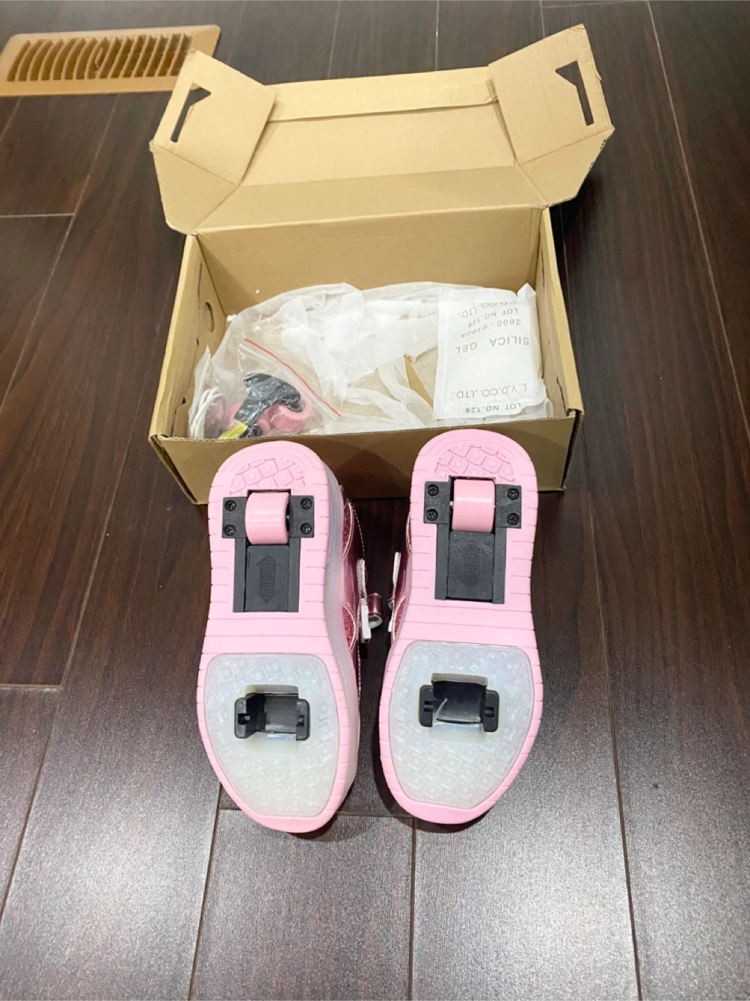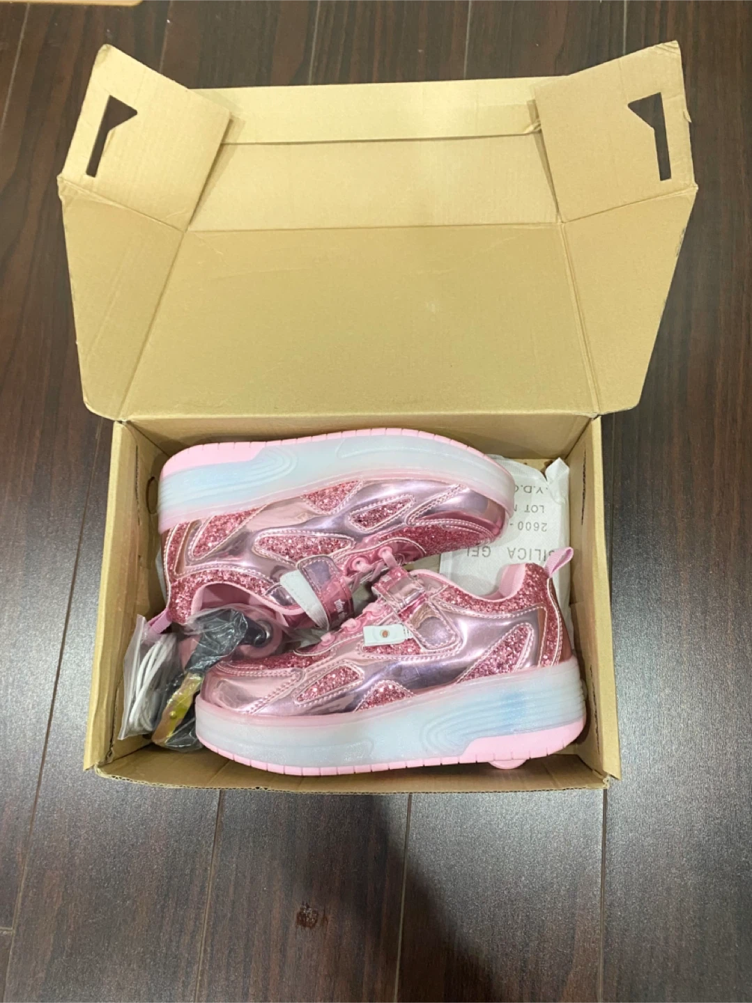 Features: Built-in wheels for rolling, LED light-up soles (mention if they are USB rechargeable and if the charger is included)
