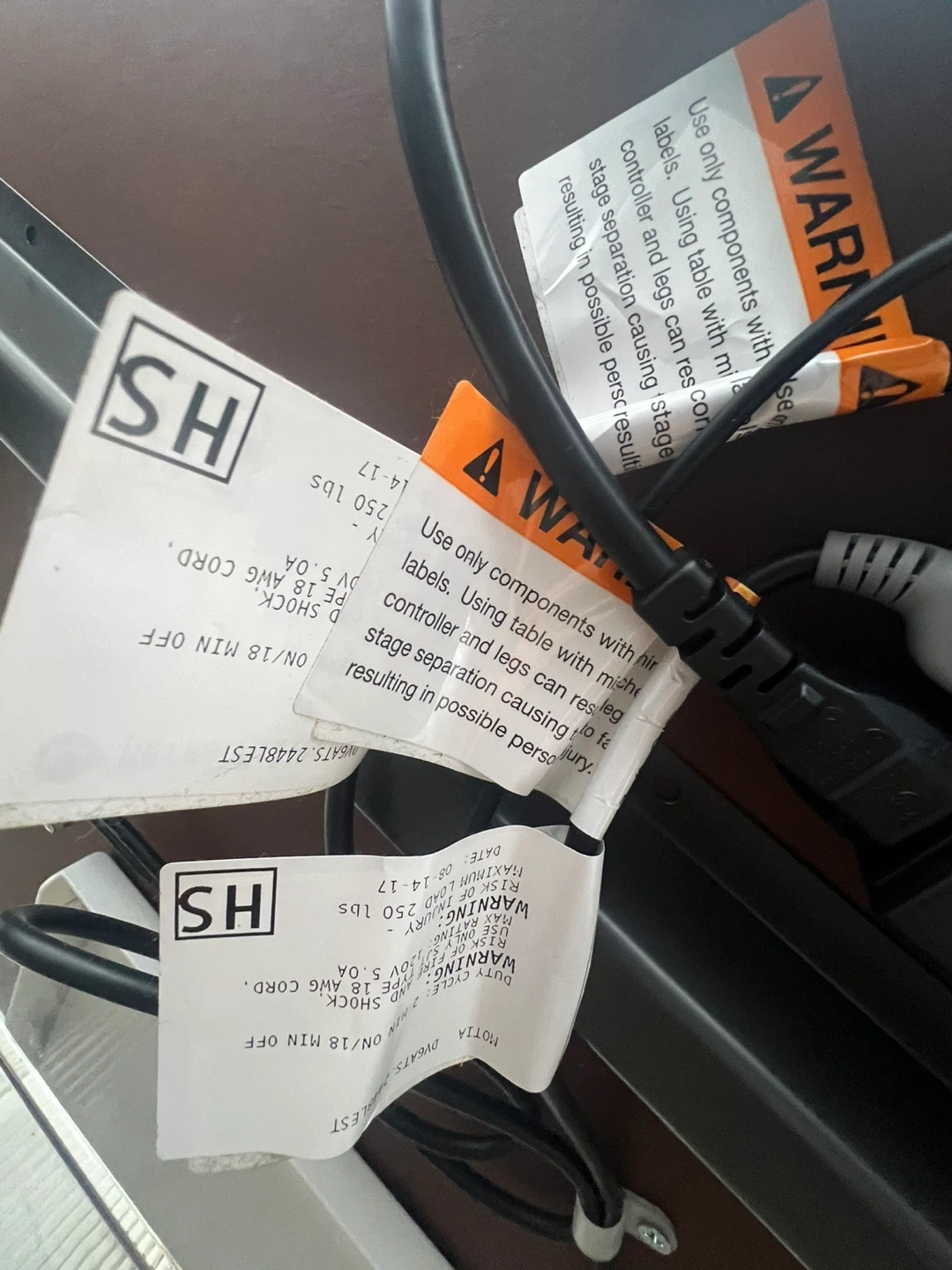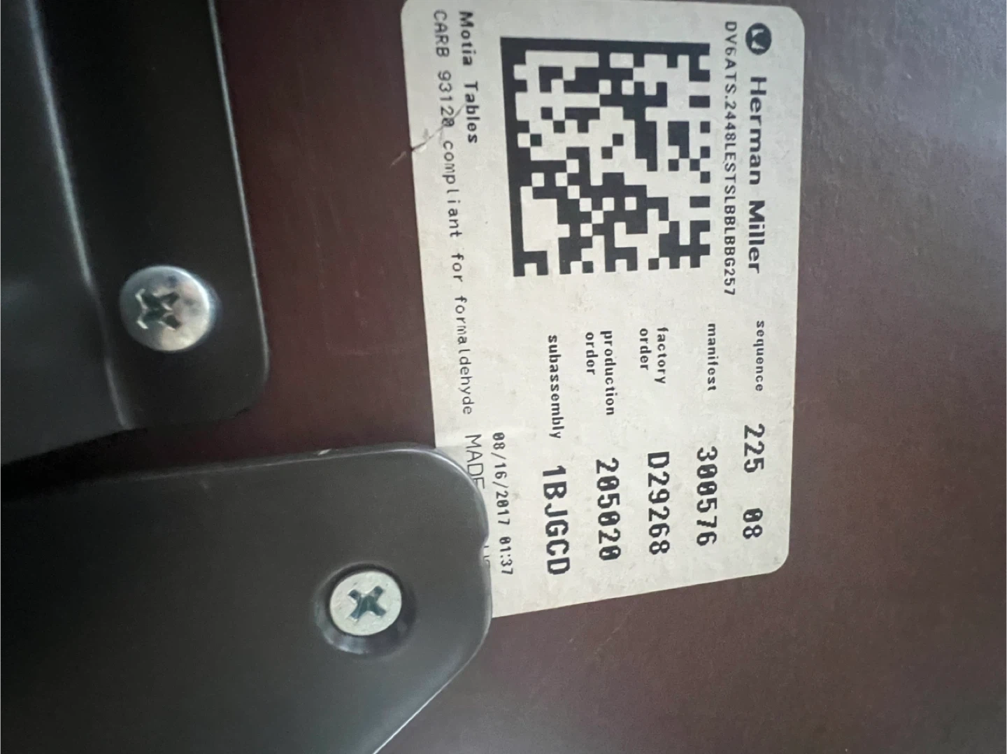 Selling a Herman Miller Motia standing desk! The desk features a light-colored tabletop and black legs. The manufacturing date is August 16, 2017. Adjustable height with the push of a button!