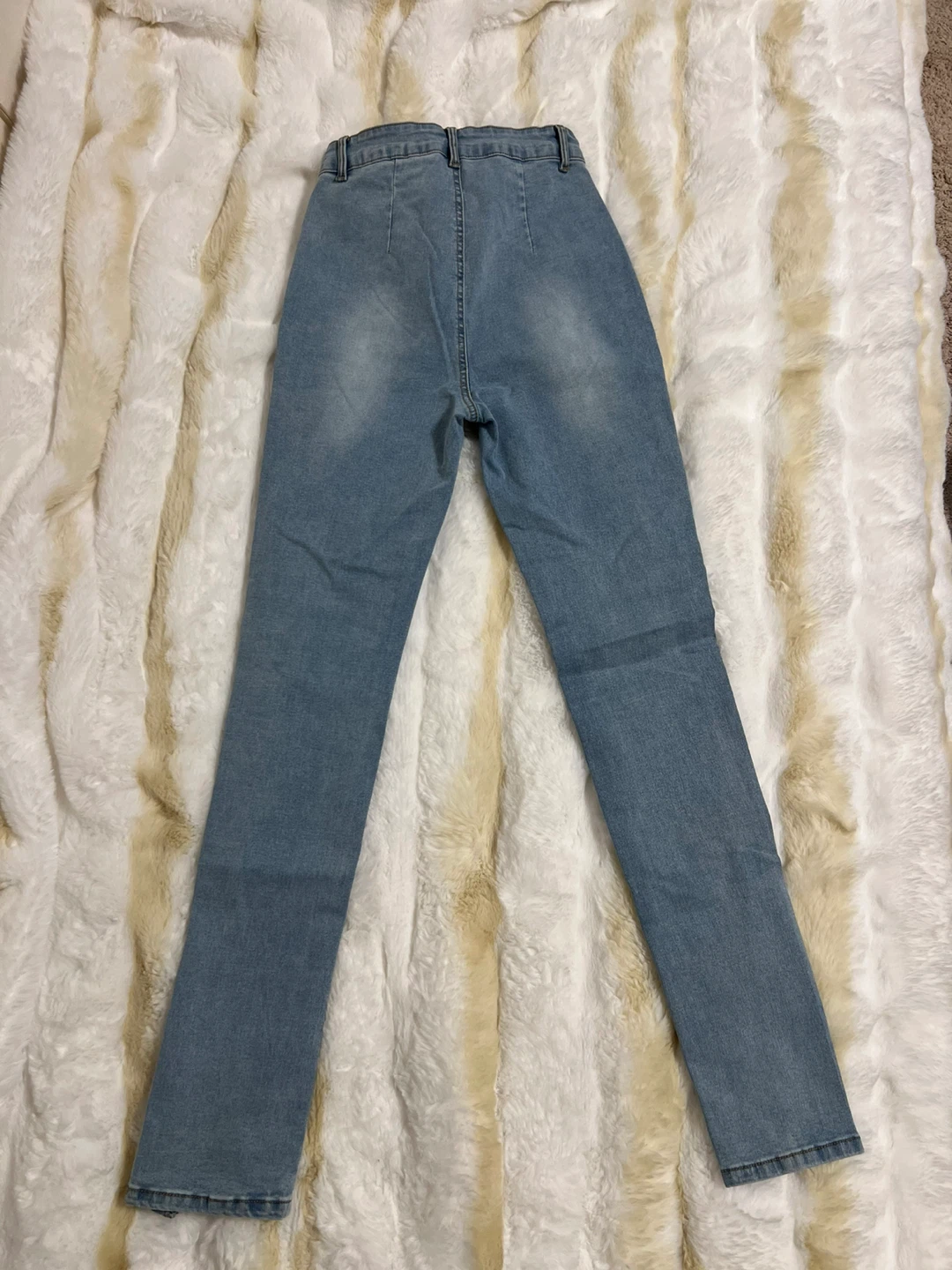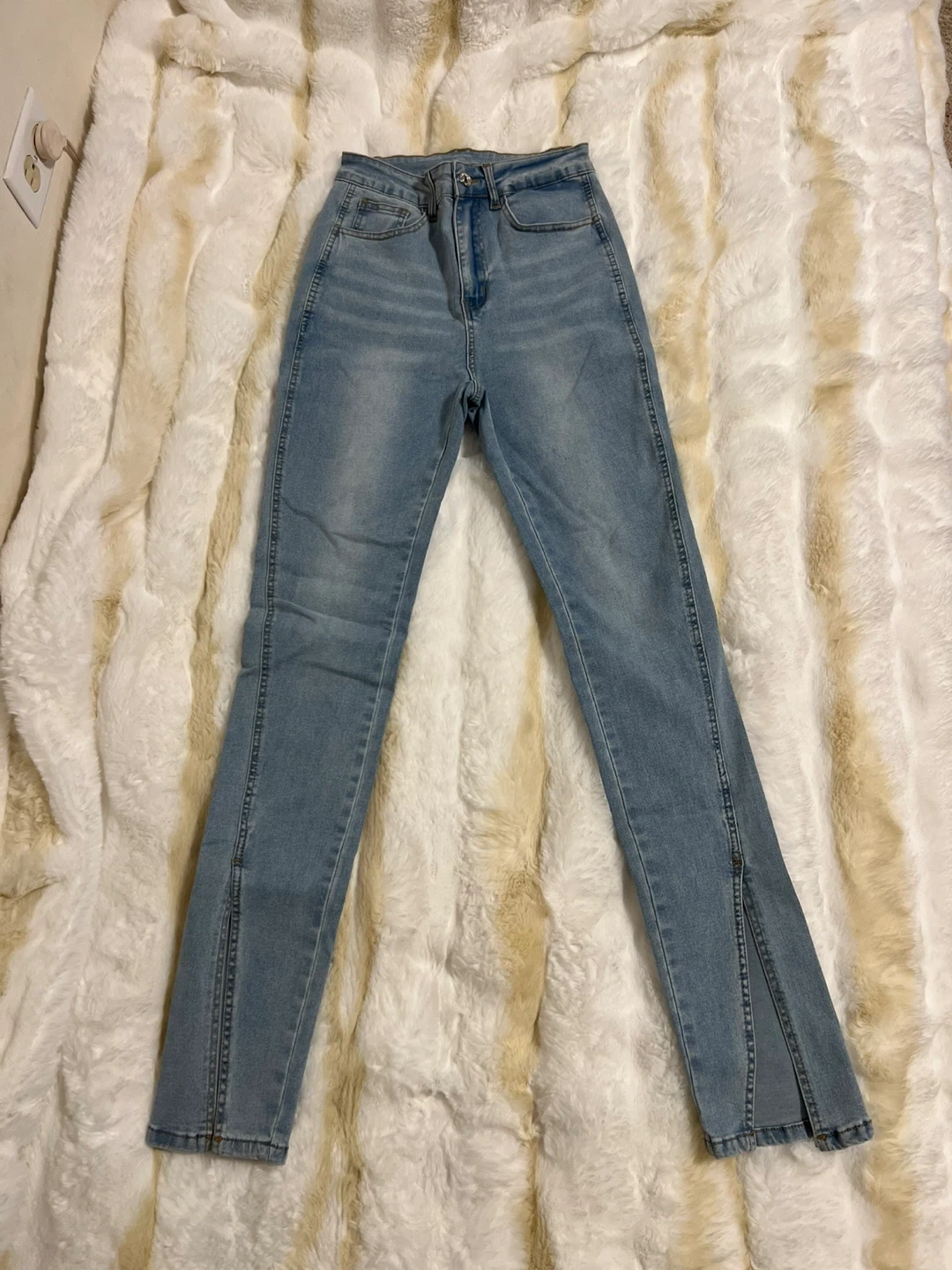 Selling a pair of light wash jeans from SHEIN in size S. They have a stylish split hem detail at the bottom. They're NEW( no taggs)and ready for a new home!