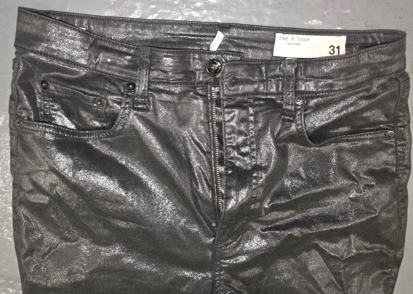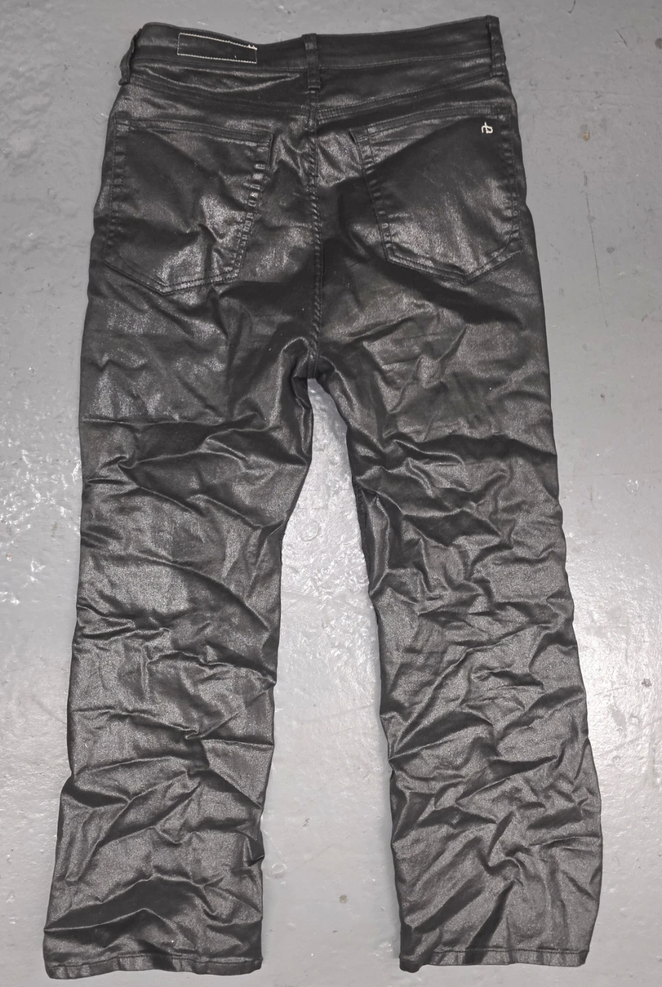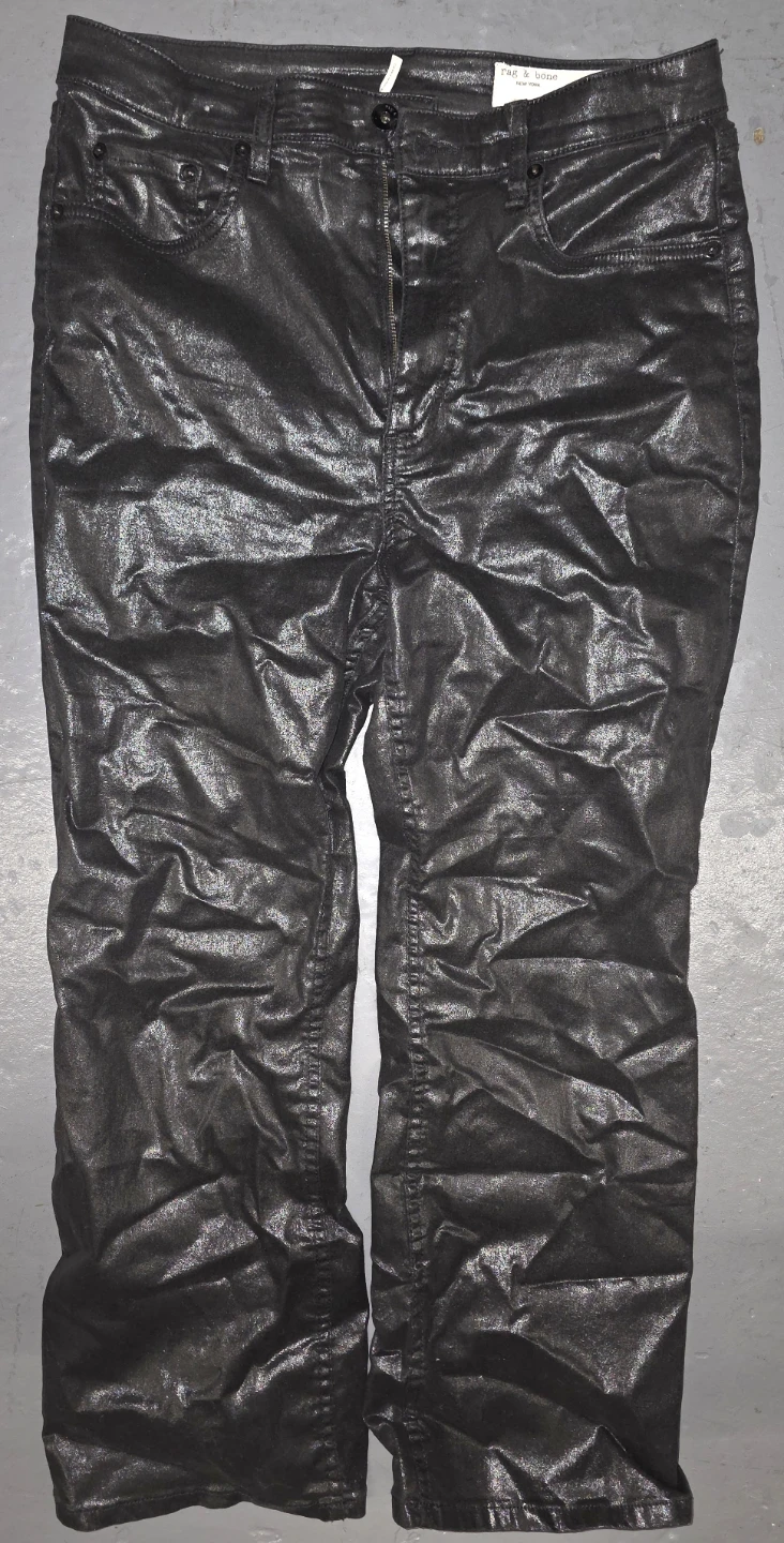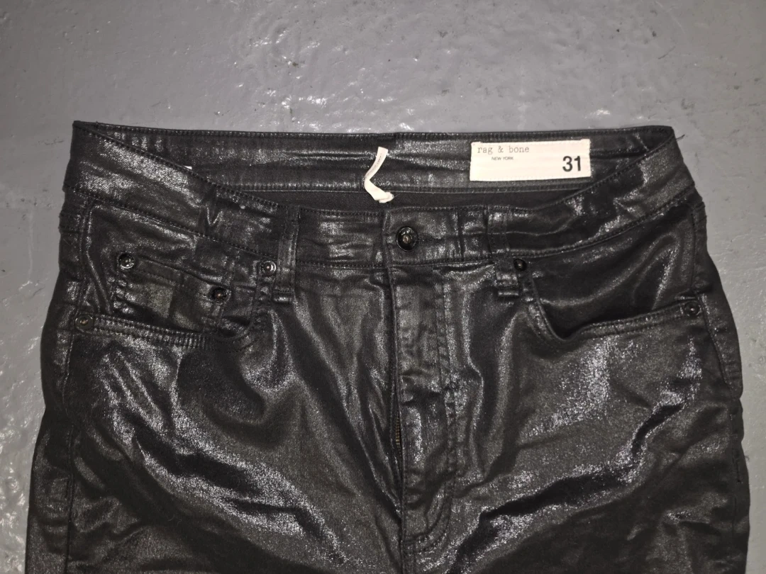Selling a pair of Rag & Bone jeans in size 31. They have a unique coated finish, giving them a cool, slightly shiny look. Perfect for adding a bit of edge to your wardrobe!