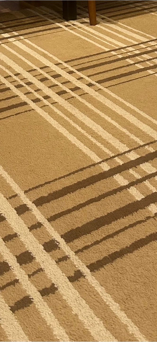 Selling a patterned area rug. The rug has a striped pattern in brown and tan tones. It's perfect for adding warmth and style to any room!