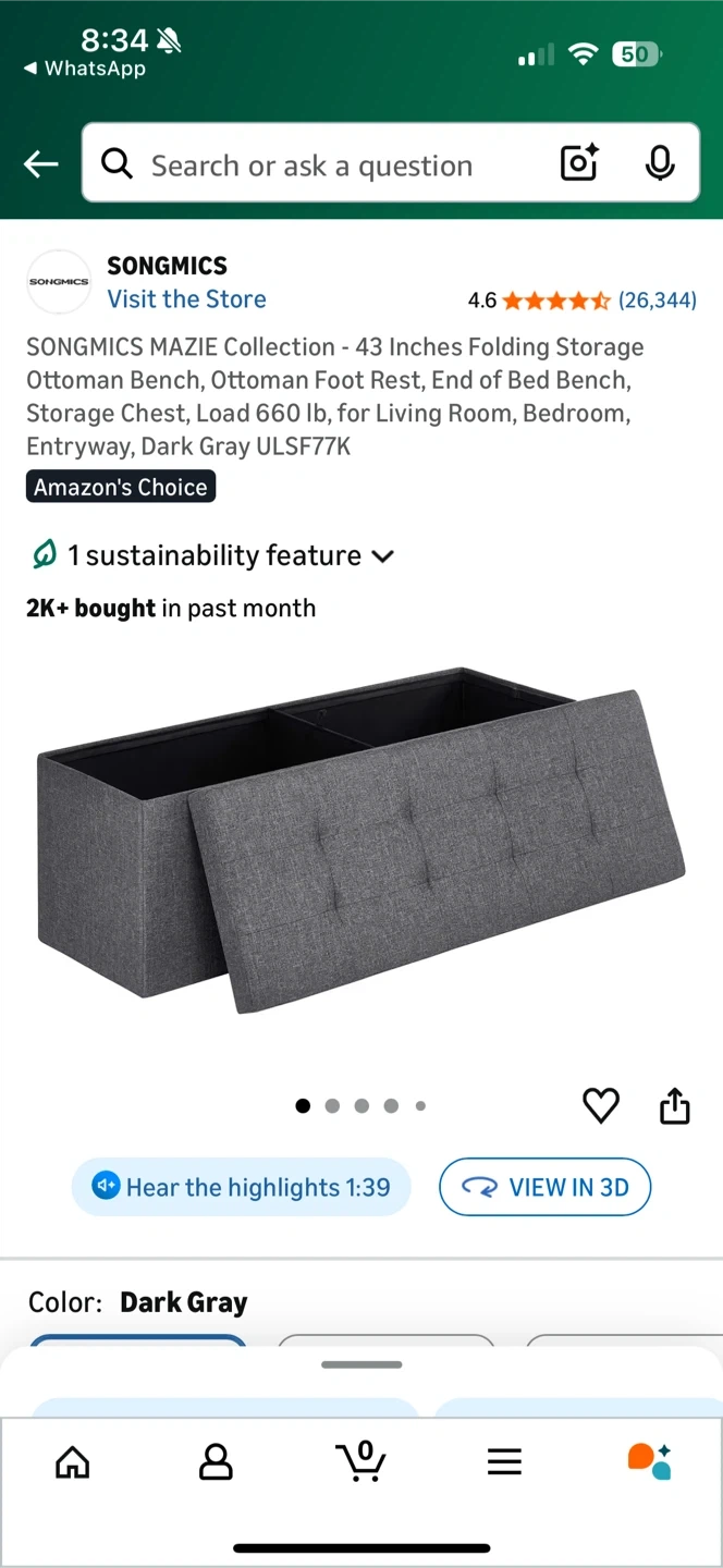 Selling a SONGMICS MAZIE Collection 43 Inches Folding Storage Ottoman Bench in Dark Gray. This ottoman can be used as a foot rest, end of bed bench, or storage chest. It can load up to 660 lbs! This is perfect for a living room, bedroom, or entryway