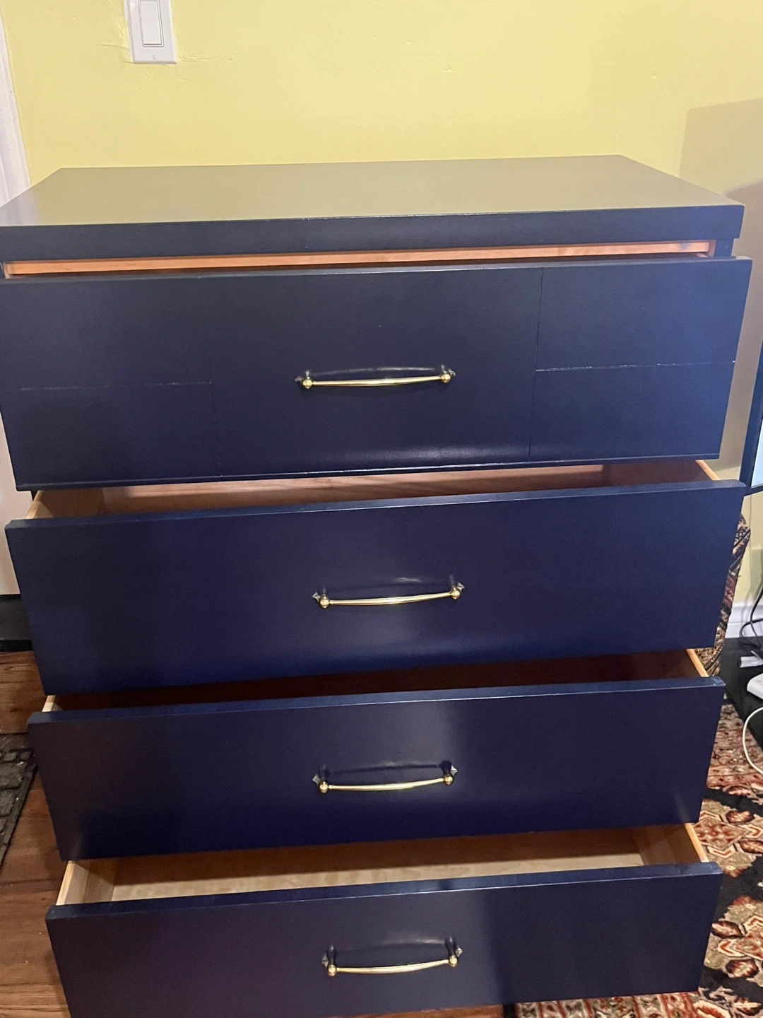 Refinished MCM Midnight dark blue chest of drawers from Victoriaville Furniture. It's a great piece for adding some storage and style to any room in your home!