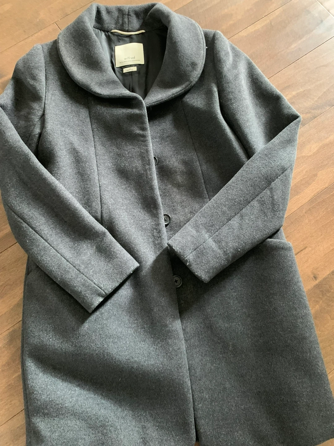 Selling a gently used Wilfred Cocoon Coat in a lovely grey colour. It's a size Xsmall and in great condition. Perfect for those cooler days!