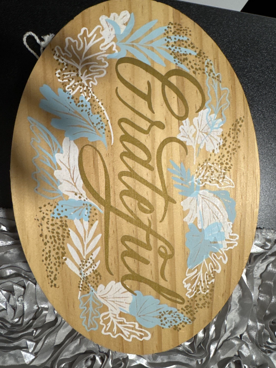 A lovely wooden wall decoration with the word 'Grateful' surrounded by a beautiful leaf design. It's in great condition and ready to add a touch of warmth to your home
