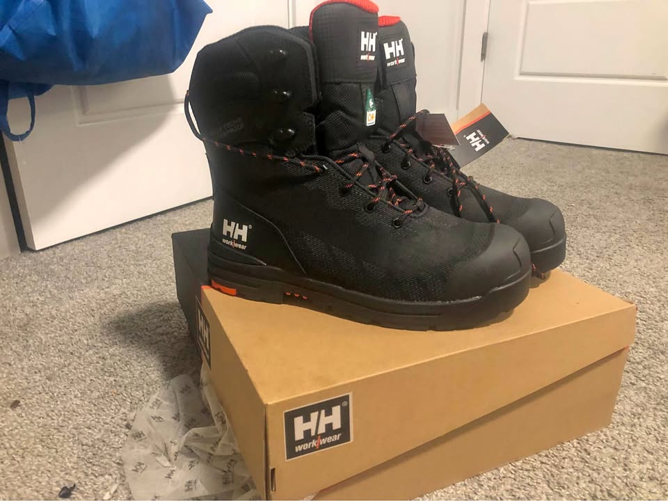 Brand new Helly Hansen work boots, size US 11. Black with red accents. Still in original packaging with tags. Great for work or outdoor activities.