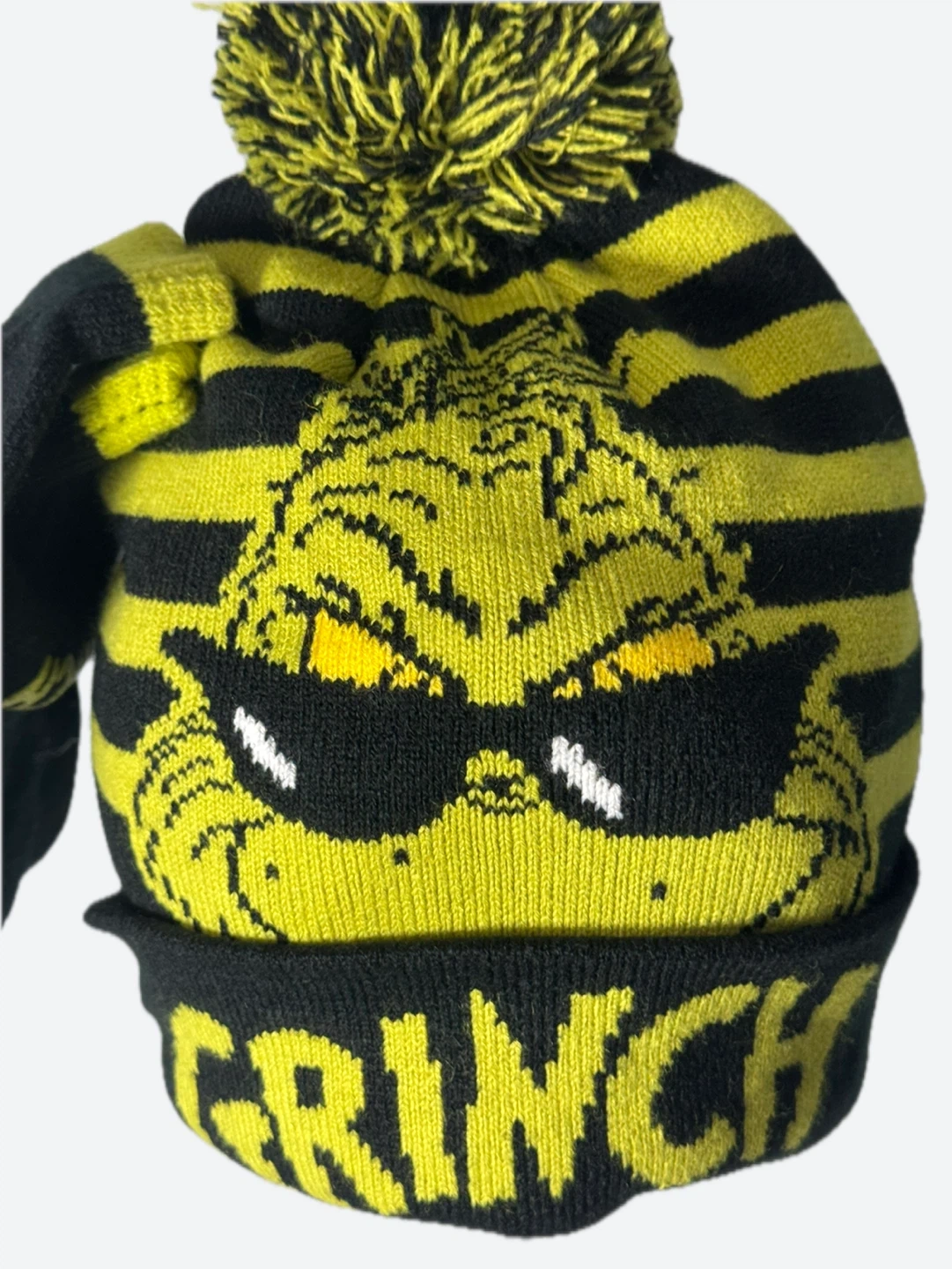The hat features a cool Grinch design with stripes, and the gloves have 'Grinch' embroidered on them.