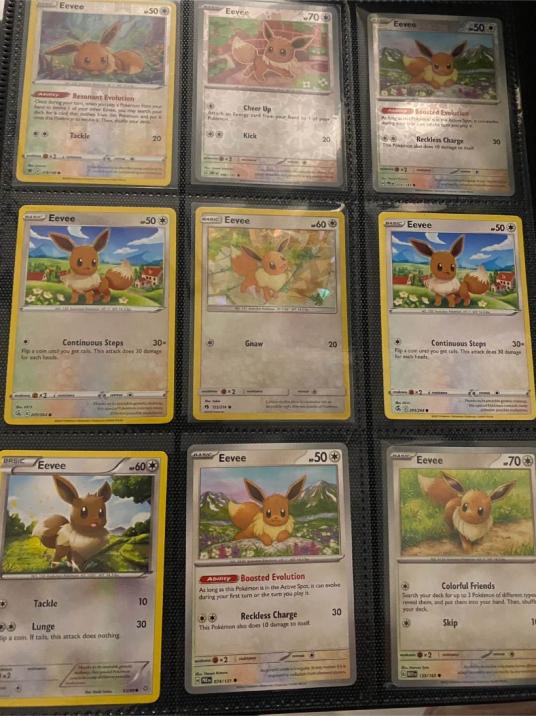 Selling a collection of Eevee evolution Pokemon cards! Includes Jolteon, Flareon, Leafeon, Sylveon, Espeon, Umbreon, Glaceon, and Vaporeon, along with multiple Eevee cards