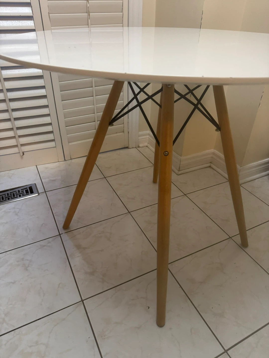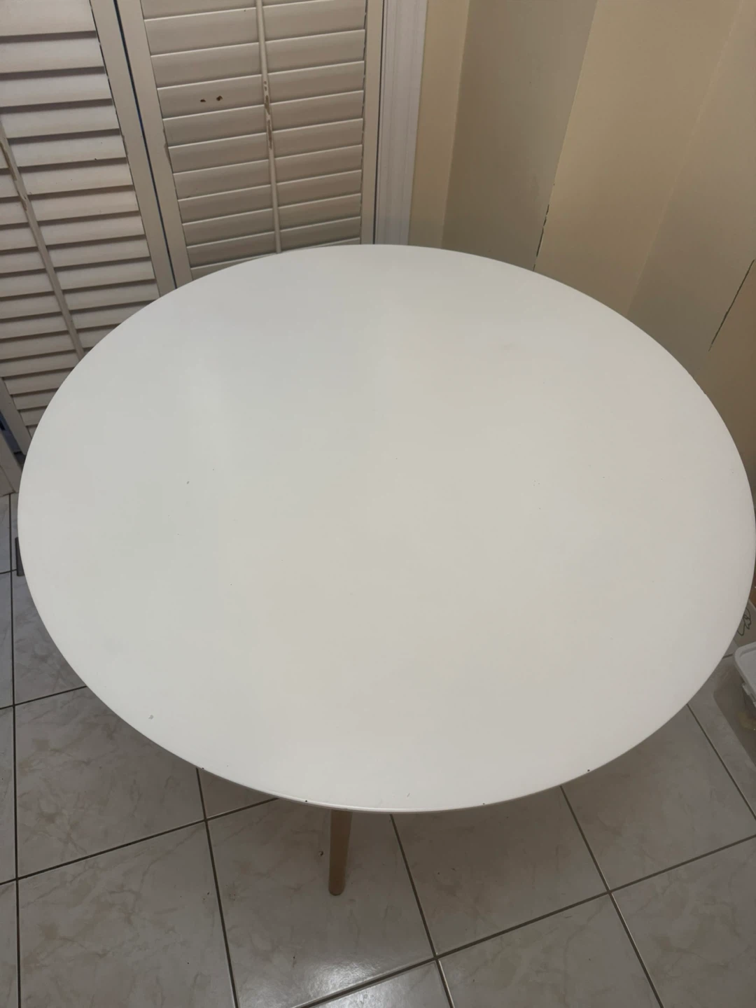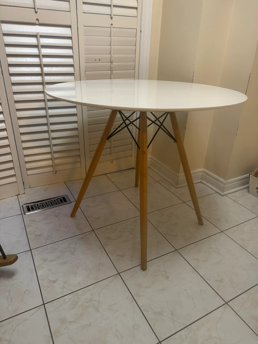 Selling a round dining table with a white top and wooden legs. It's in great shape and would be perfect for a small dining area or kitchen nook. The table is sturdy and stylish, adding a modern touch to any space. Slight wear & teat