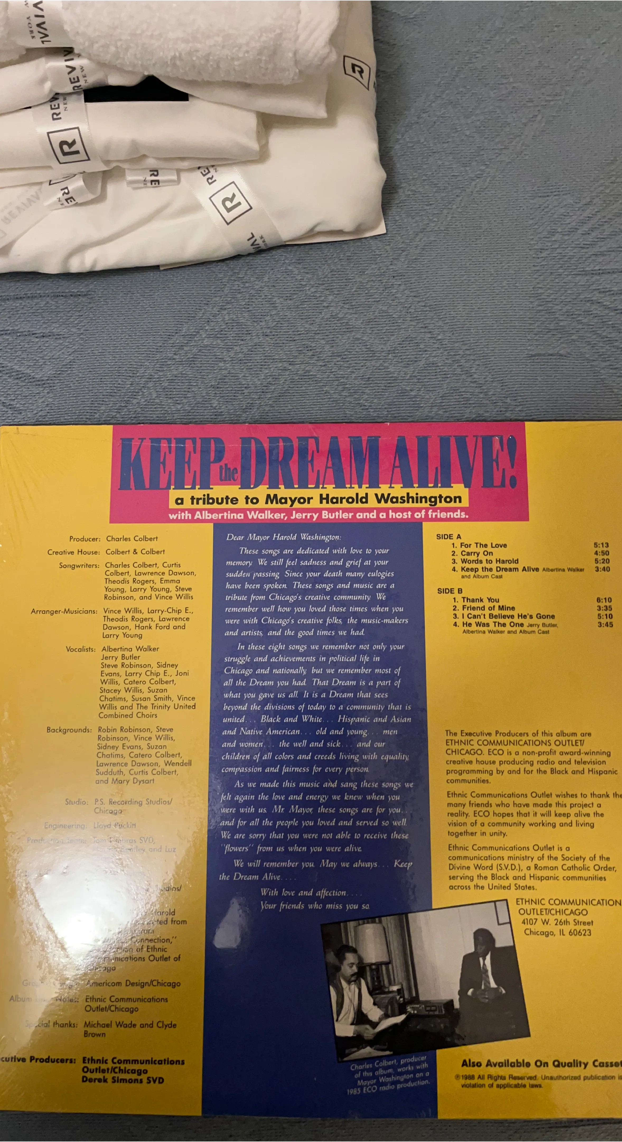 Selling a vinyl record album titled "Keep Dream Alive! a tribute to Mayor Harold Washington with Albertina Walker, Jerry Butler and a host of friends". The album is produced by Charles Colbert and Colbert and released by Ethnic Communications Outlet.