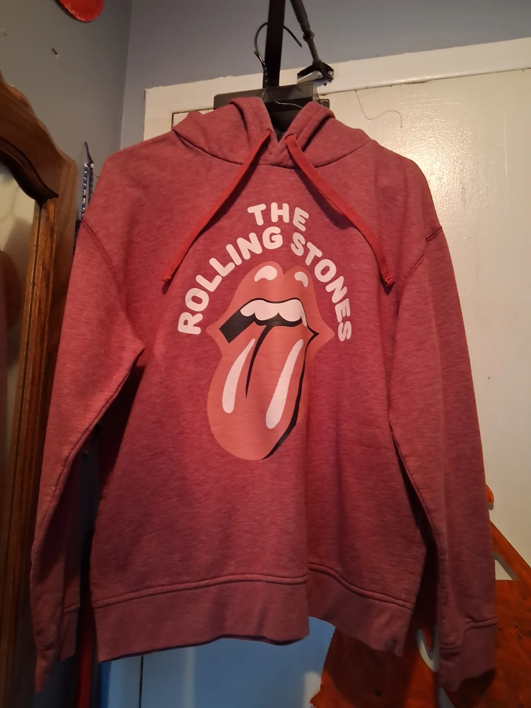 Cozy Rolling Stones hoodie in a lovely maroon colour! It's in great condition and features the iconic Rolling Stones logo on the front. Perfect for any fan! It's labeled large but I feel it is smaller than a large.