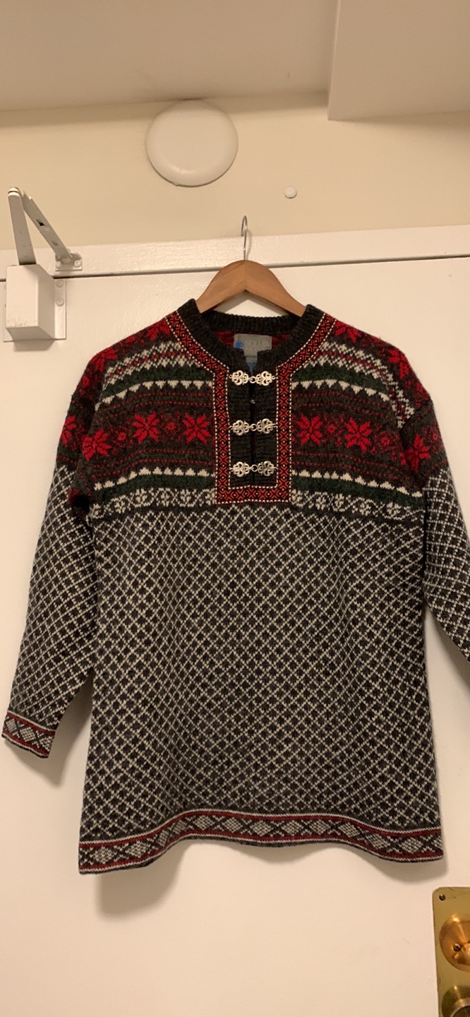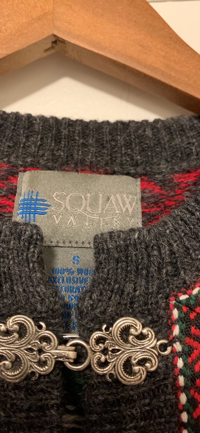 Cozy Squaw Valley wool sweater in size small! It features a lovely pattern with red and green detailing on a grey background. Perfect for staying warm and stylish during the colder months