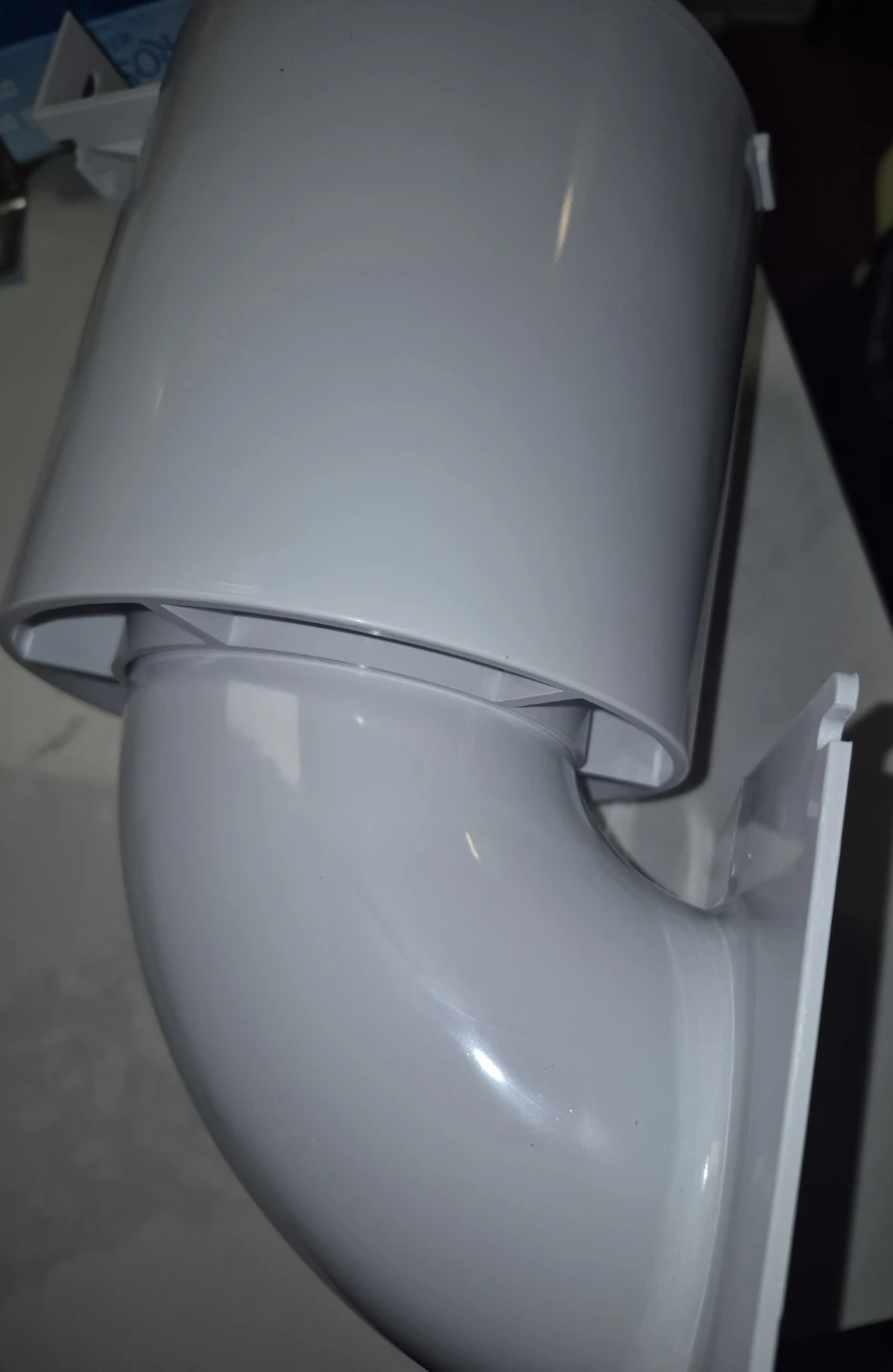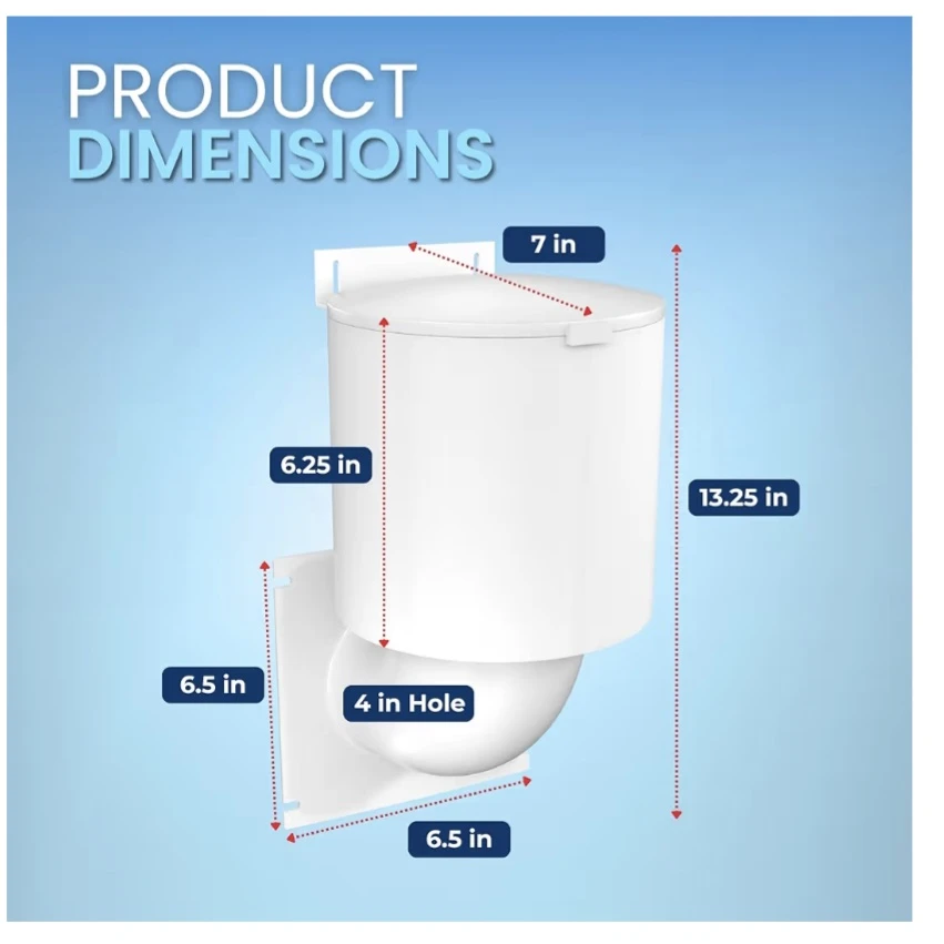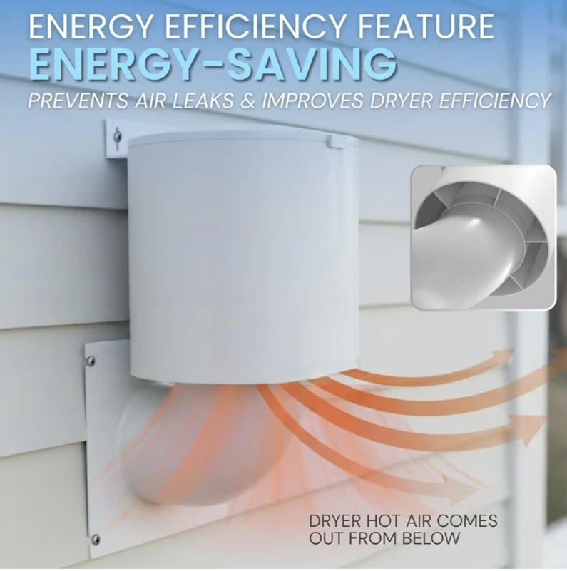 This is a white dryer vent cover. It's designed to prevent air leaks and improve dryer efficiency. The dimensions are approximately 7 inches in height and 6.25 inches in width. It also features a floating cup design that allows air to escape when the dryer is working and closes the vent when the dryer is off