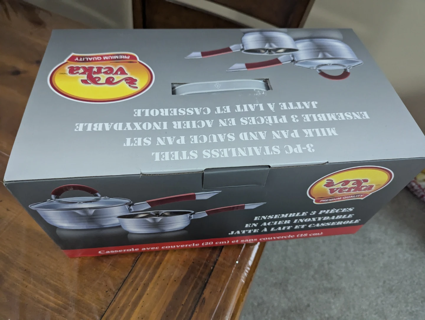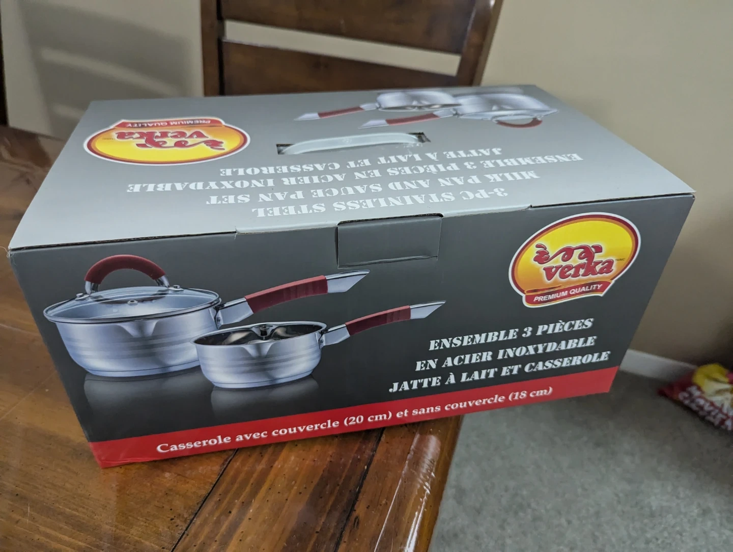 Selling a brand new Verka 3-piece stainless steel milk pan and sauce pan set! The set includes a casserole with a lid (20 cm) and a saucepan (18 cm). Perfect for your cooking needs